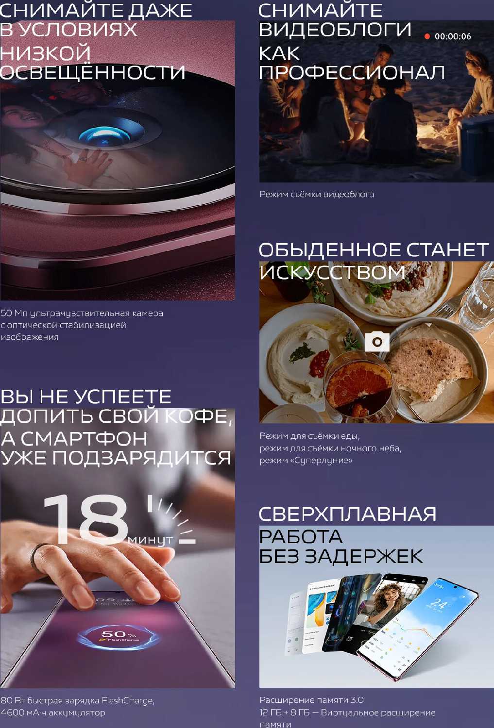 Встроенный аккумулятор на 4600 мАч демонстрирует неоднозначные результаты. При умеренном использовании (4-5 часов экранного времени, фоновый VPN, геолокация, музыка через Bluetooth) заряда хватает на полный день. Однако активная нагрузка (игры, съёмка видео, мобильная раздача интернета) сокращает жизнь до 6-7 часов. Спасение — фирменная зарядка на 80 Вт: 20-100% за 30 минут. Пользователи ценят, что блок питания и кабель входят в комплект, но критикуют отсутствие беспроводной зарядки. Любопытно, что режим энергосбережения продлевает работу на 20-25%, но отключает фоновые процессы — это неудобно для тех, кто использует умные часы.