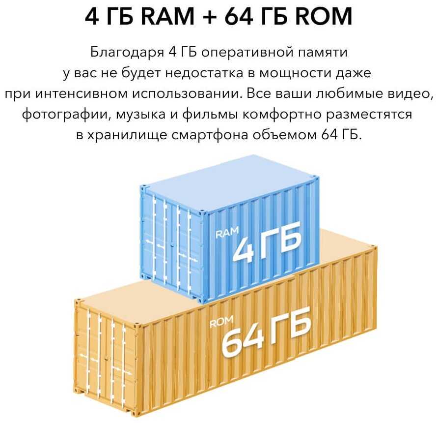 - + Телефон очень даже не плохой. ОЗУ и 64 внутренней, правда 20 сразу заняла система и программы.