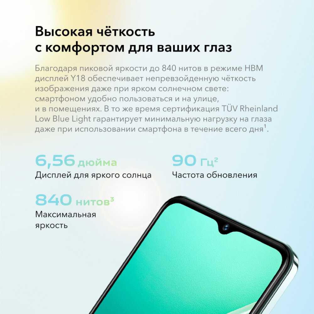 - + В качестве процессора используется восьмиядерный MediaTek Helio G85, подходящий для игр. На борту установлено 6 гб оперативной памяти (с функцией программного расширения до ещё +6 гб). Постоянной памяти здесь 128 гб (также есть поддержка карт памяти, ёмкостью до 1024 Гб). IPS-дисплей, с разрешением 1612 на 720 пикселей, поддерживает частоту обновления до 90 Гц. Пиковая яркость экрана составляет 840 нит. Основная камера на 50 мп, фронтальная камера у vivo Y18 на 8 мп. Аккумулятор 5000 мАч, с быстрой зарядкой на 15 Вт. А ещё, vivo Y18 защищен от воздействия пыли и влаги по стандарту IP54. Вес смартфона равен 185 г. В комплекте есть: кабель Type-C–USB, блок питания на 15 Вт, защитный чехол, защитная плёнка (наклеена на экран) и документация.