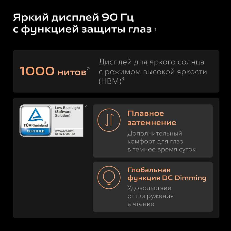 Экран с высокой плотностью пикселей и настраиваемым масштабированием текста комфортен даже для слабовидящих: многие пользователи отмечают, что максимальное увеличение шрифта в настройках Android не требуется. Яркость и контрастность достаточны для чтения при солнечном свете — информация видна даже через солнцезащитные очки. IPS-матрица без ШИМ снижает усталость глаз при длительном использовании. -