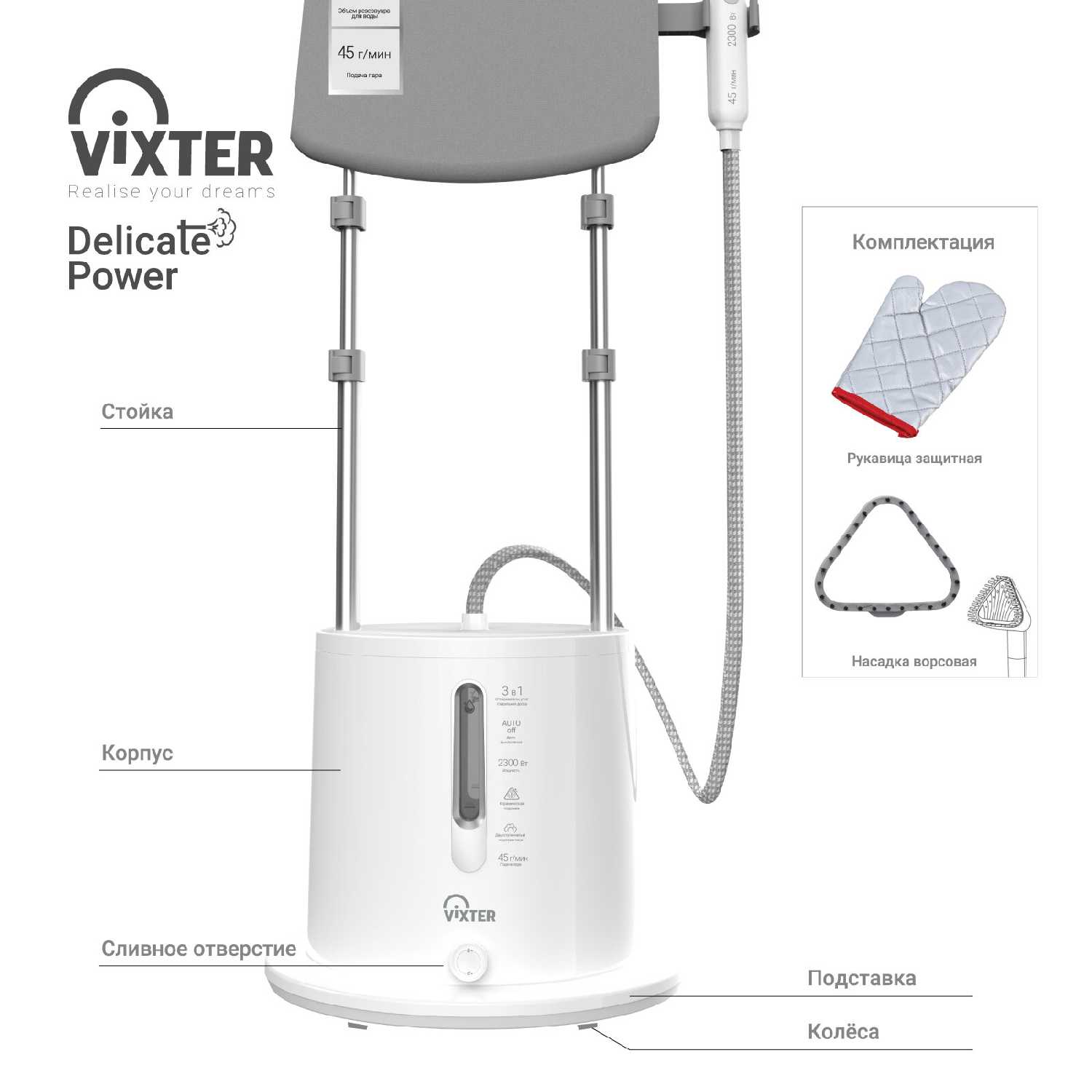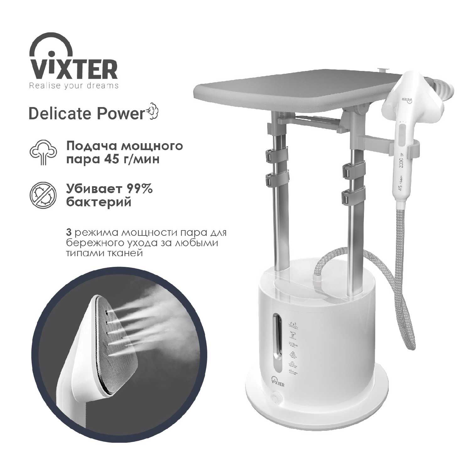 - Мощность 45 г/мин быстро разглаживает деликатные материалы (шелк, лайкра).