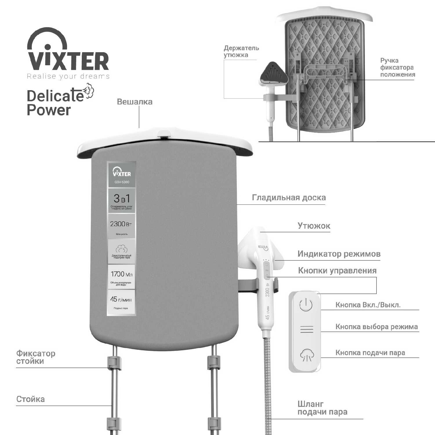 - Крепление утюга расположено под углом 45°, блокирует доступ к одной стороне одежды.