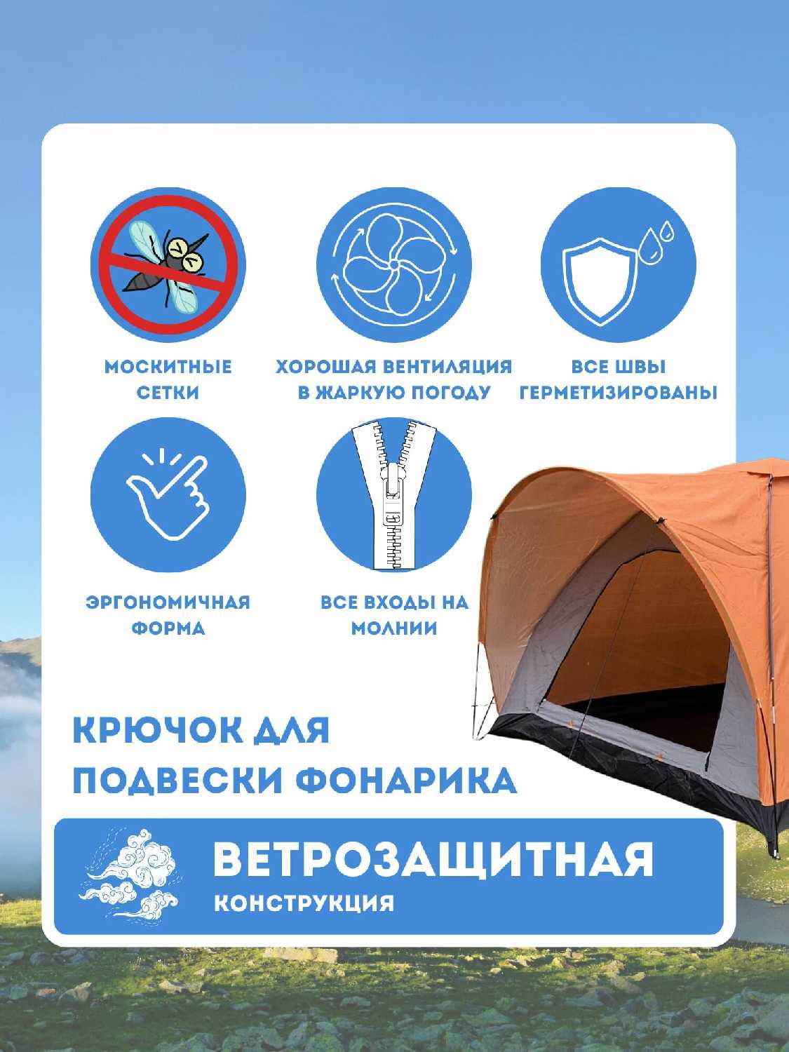 - Наличие двух симметричных входов/выходов, каждый с москитной сеткой, обеспечивает гибкость планировки лагеря и удобство перемещения людей без необходимости перелезать друг через друга.