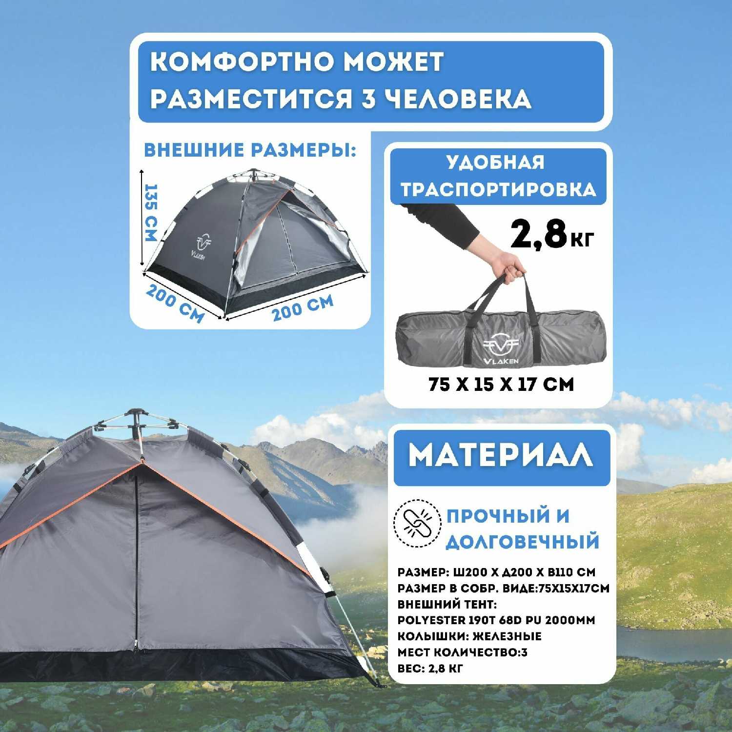 - + Очень просторная. Три человека уместились легко. Сборка и разборка 5 минут. Вход/выход с двух сторон, москитная сетка. Дождь и ветер выдержала.