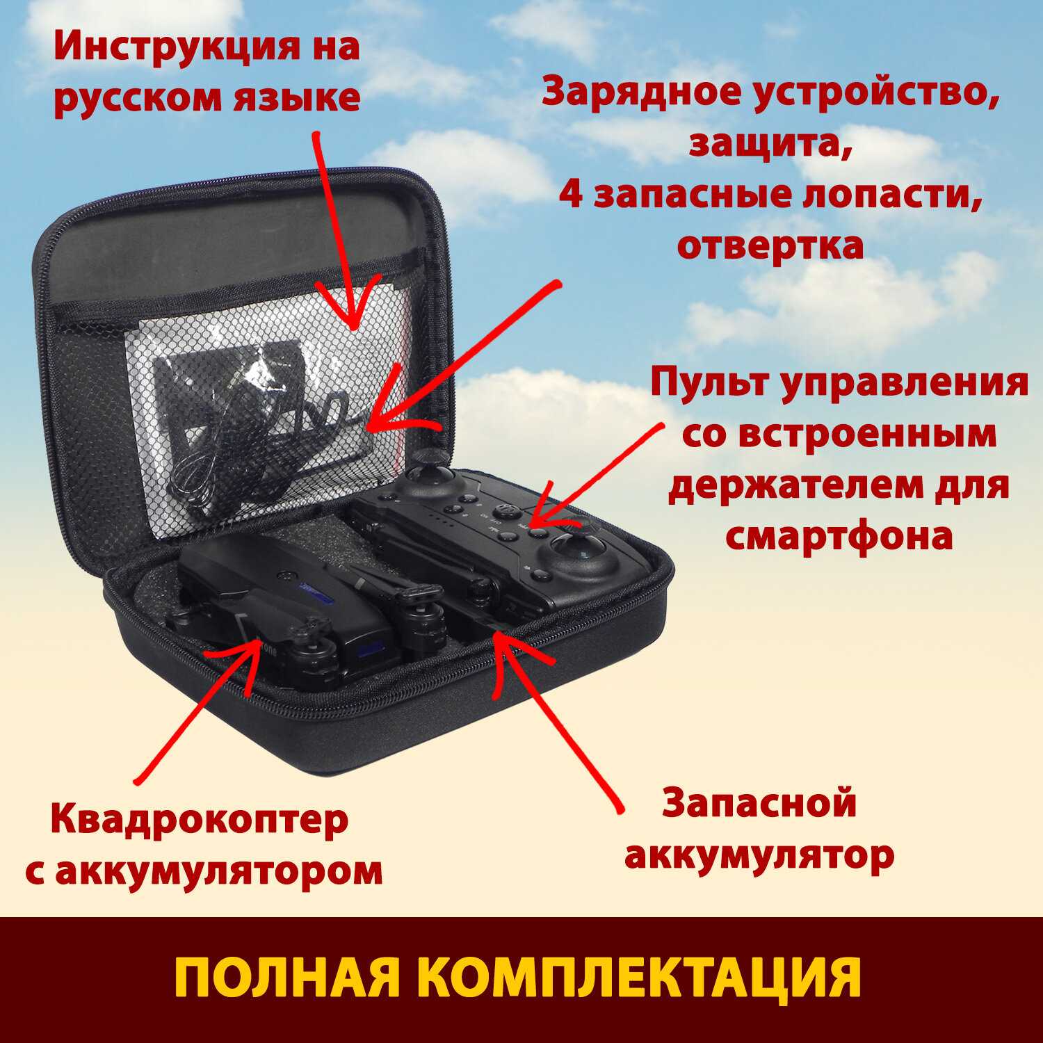 В комплекте обычно есть 2–3 сменных аккумулятора, удобный кейс для переноски и защита для лопастей, что упрощает хранение и использование. Однако защита лопастей часто отлетает при ударах или не спасает от поломок, а сумку пользователи хвалят за компактность. Дополнительные батареи компенсируют короткое время полёта, но их зарядка занимает часы. -