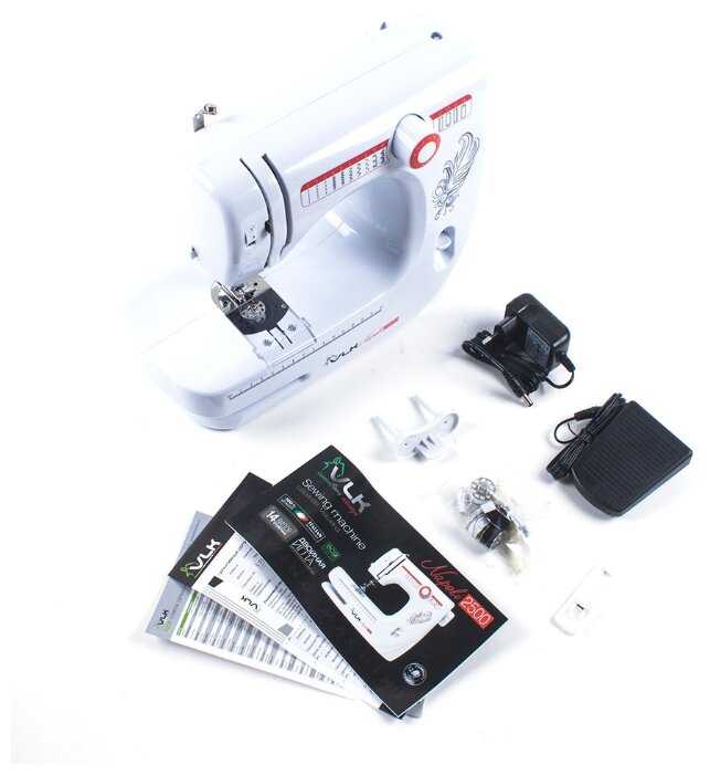 - Включает множество лапок (для молнии, петель, пуговиц), двойную иглу, металлические шпульки, иглы.