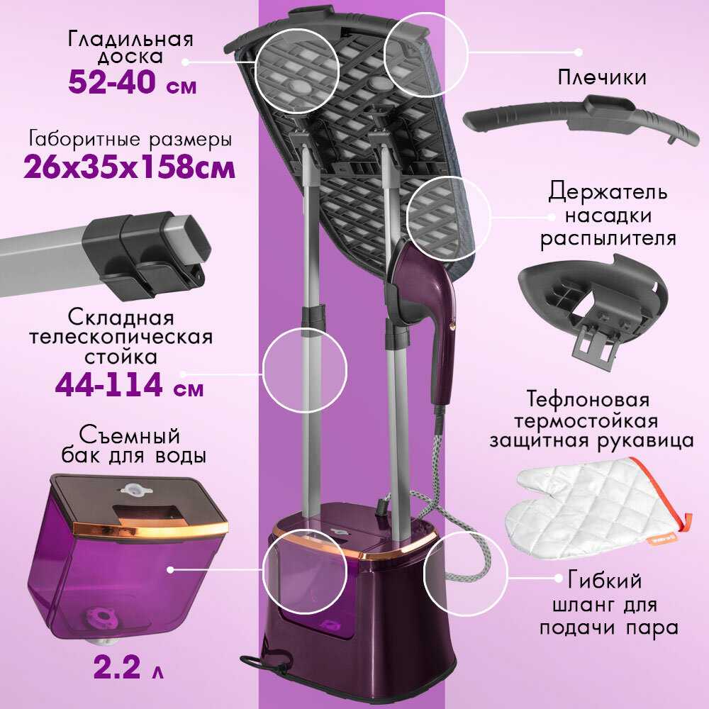 В базовой поставке есть рукавица для отпаривания, но некоторые покупатели получили устройство без неё или с поврежденной насадкой. Вешалка-плечики удобна для рубашек, однако кронштейн для подвеса утюжка мешает при работе с широкими вещами — его приходится снимать. -
