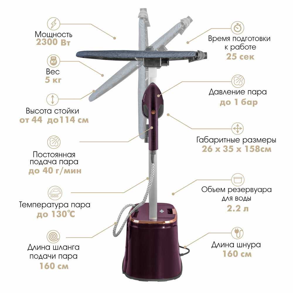 Эргономика имеет как положительные, так и отрицательные стороны. Пользователи ценят большой объем резервуара для воды (2.2 л), позволяющий долго работать без дозаправки, наличие и функциональность гладильной доски для обработки вещей, а также жесткий, не перегибающийся шланг в сравнении с конкурентами. Однако удобство сильно омрачается короткой длиной как шланга подачи пара (не хватает сантиметров 30 для комфортного доступа до верха вещей), так и сетевого шнура. Крепление для ручки утюжка часто критикуют: оно может быть неудобно расположено, скрываться под отпариваемой одеждой, мешая временно повесить инструмент, или выглядеть ненадежным. Некоторые отмечают неудобство при работе "на весу" – прибор плохо справляется с сухими или даже слегка влажными вещами в этом режиме. Отсутствие индикатора низкого уровня воды также затрудняет использование. Прибор требует определенного "приноравливания", а постоянная подача пара без возможности кратковременного отключения утюжка (чтобы перевесить вещь) раздражает пользователей.