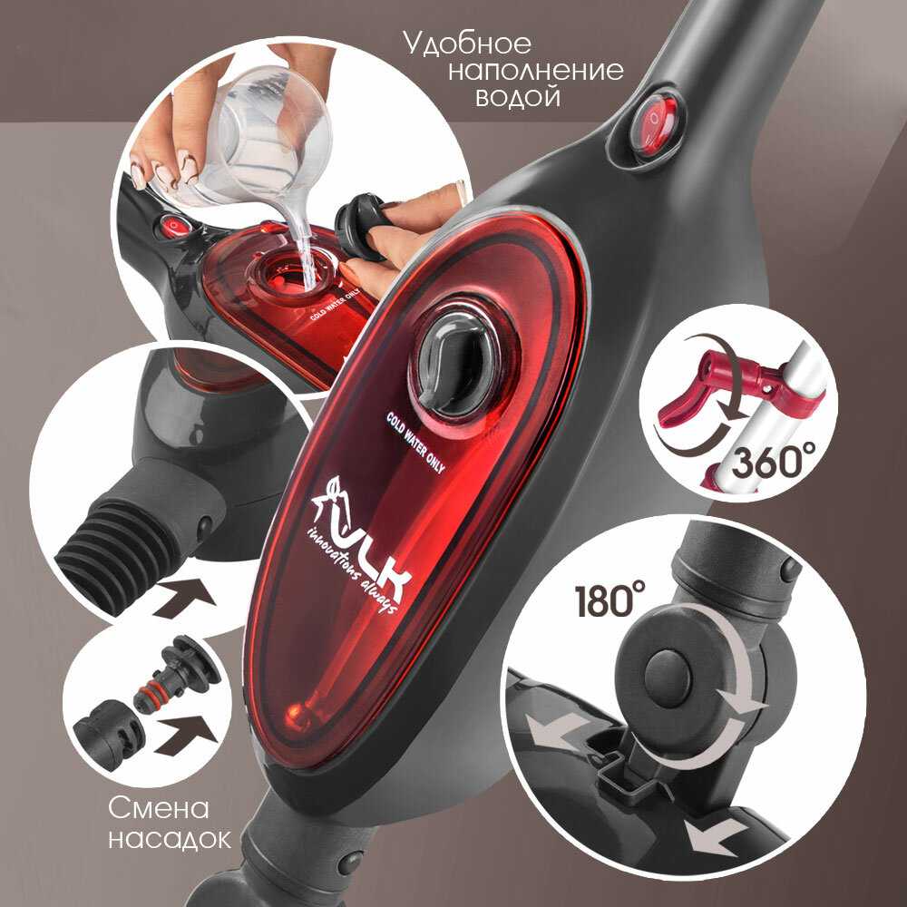 Переключатель пара, активируемый ногой, позволяет регулировать подачу без остановки работы. Однако некоторые пользователи отмечают неудобство из-за веса ручки (особенно при обработке вертикальных поверхностей) и короткого шнура, требующего использования удлинителя для больших помещений. -