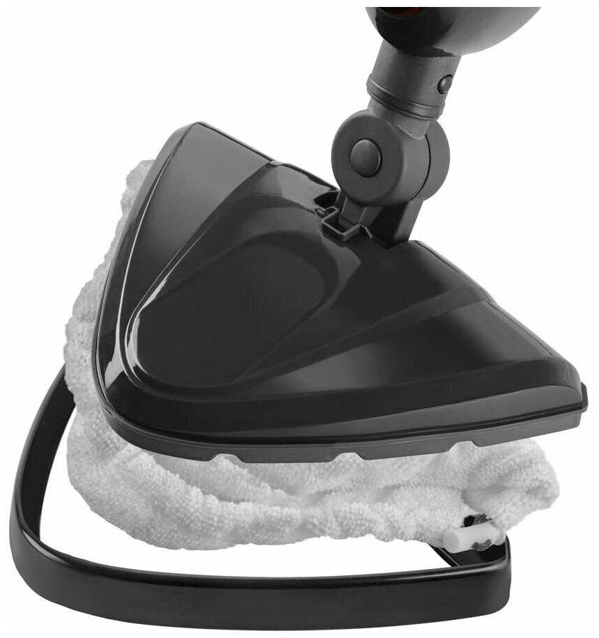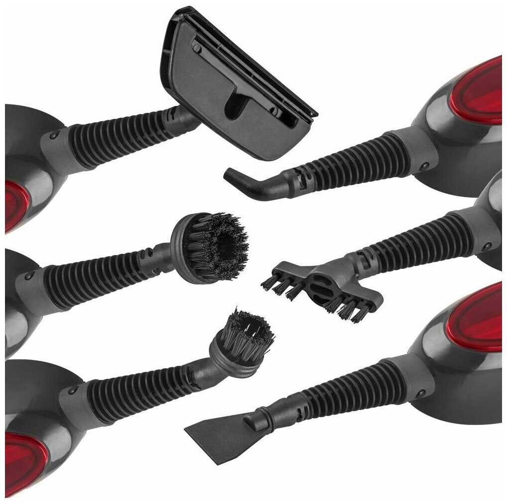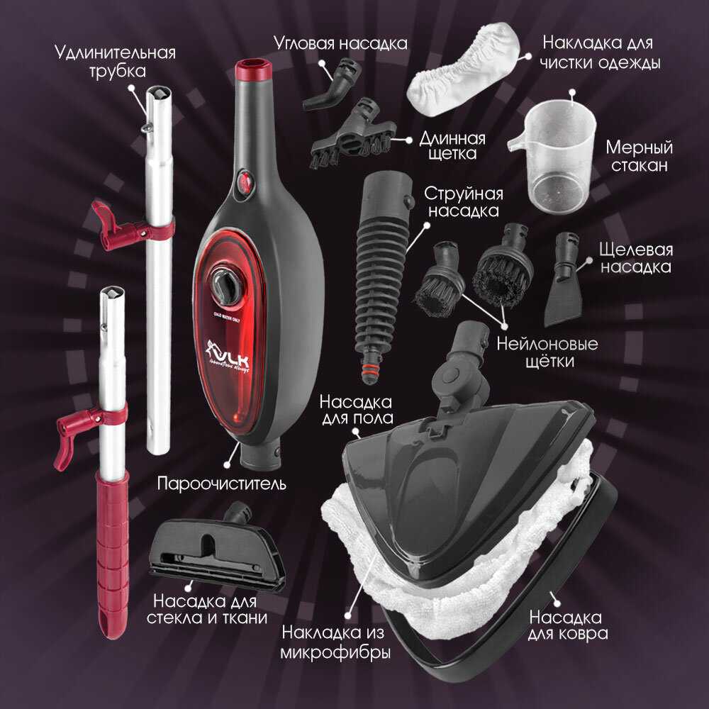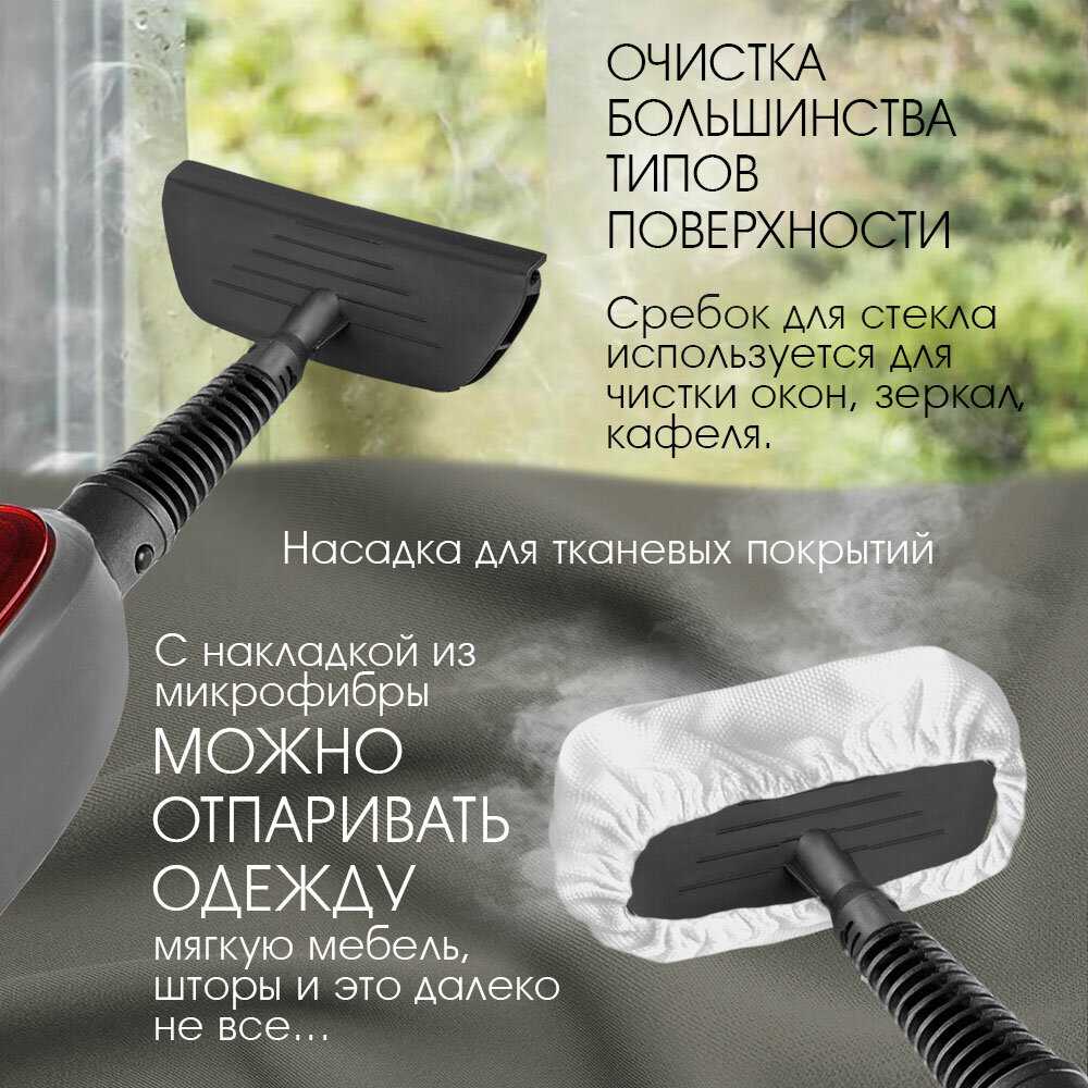 Стандартная комплектация включает 5-6 специализированных насадок: треугольная для пола, круглая для плиточных швов, узкая щелевая для углов, скребок для стекол и текстильная для мебели. Критикуется отсутствие креплений для хранения насадок на ручке и всего одной сменной тряпки из микрофибры, которая изнашивается через месяц активного использования.