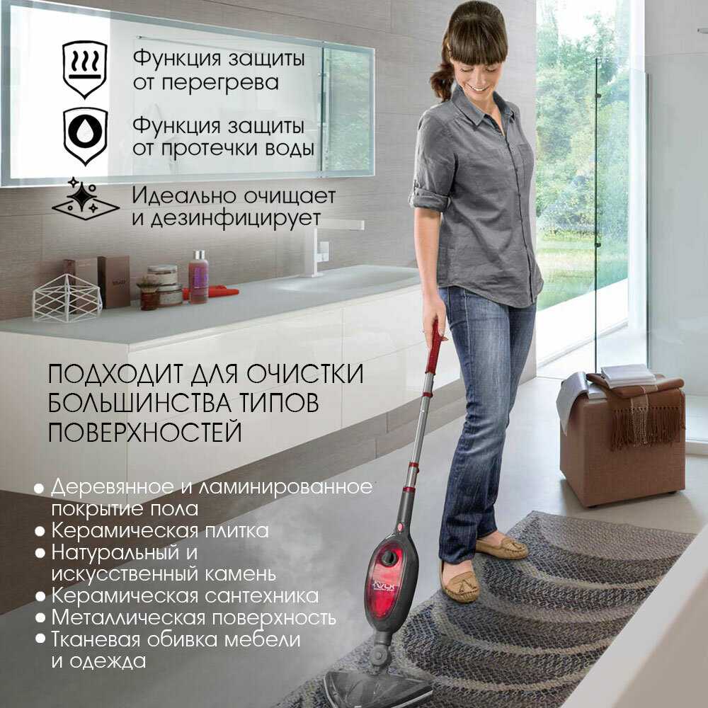Благодаря температуре пара 120°C швабра обеспечивает глубокую дезинфекцию, уничтожая бактерии на полу, стенах и сантехнике. Пользователи добавляют хлорку в резервуар для усиления эффекта, что особенно актуально при наличии домашних животных или детей. После обработки поверхности остаются не только чистыми, но и теплыми, без химического запаха. -