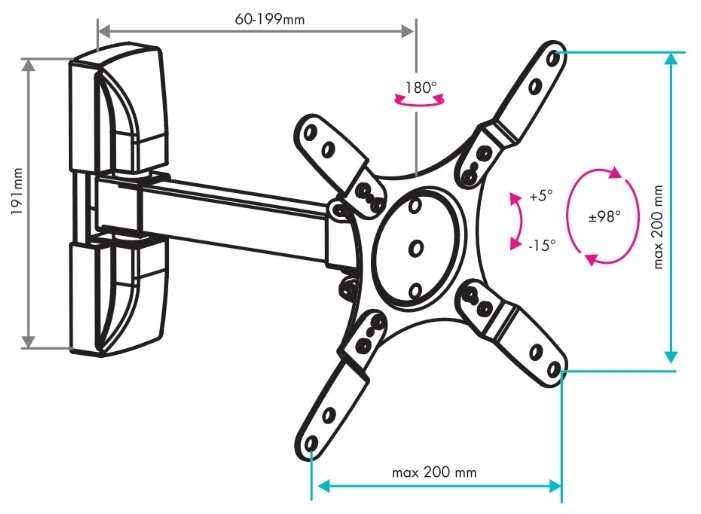 | Дополнительная информация : | расстояние от стены (мм): 60-199, угол наклона(°): +5 -15, угол поворота(°): 180, вращение экрана(°): 98 |