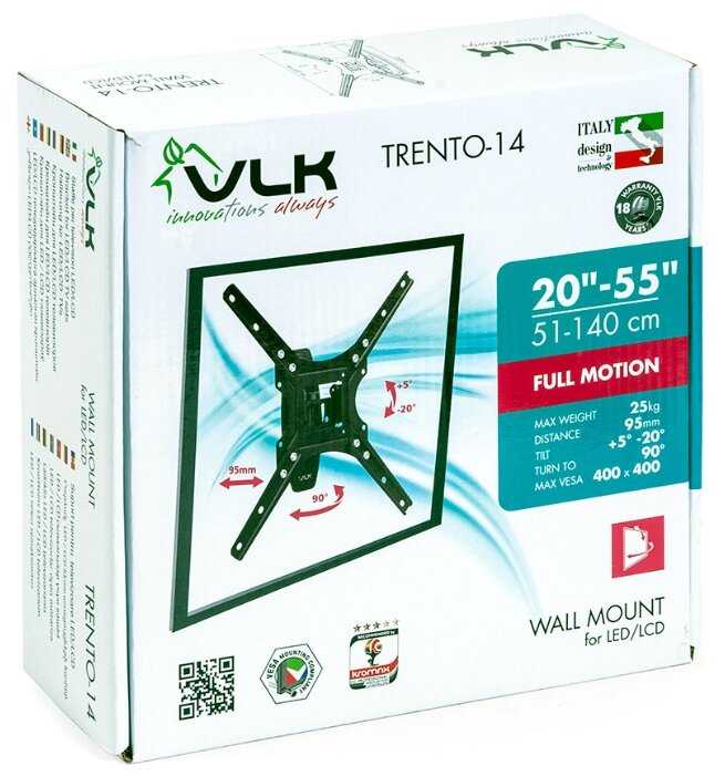 Один телевизор в квартире уже давно висит на настенном кронштейне, так что, при покупке второго телевизора, кронштейн под него приобрели сразу же, так как находим такую установку телевизора самым удобным вариантом. Кронштейн подбирали по параметрам телевизора: диагональ, вес, стандарты креплений. Из всех моделей подходящих по параметрам, выбрали эту модель VLK Trento-24, понравился ее функционал. Кронштейн подвижный, конструкция у него выдвижная, он поворачивается и его можно незначительно наклонять. Качество кронштейна понравилось, он стальной, соединения крепкие, заявленная максимальная нагрузка на него 30 килограмм, крепеж для стены и для телевизора в комплекте. По моему, за эту стоимость вариант очень даже неплохой. И сейчас, когда телевизор на нем висит, уже на практике, как говорится «наглядно» убедились, что выбор сделали хороший.