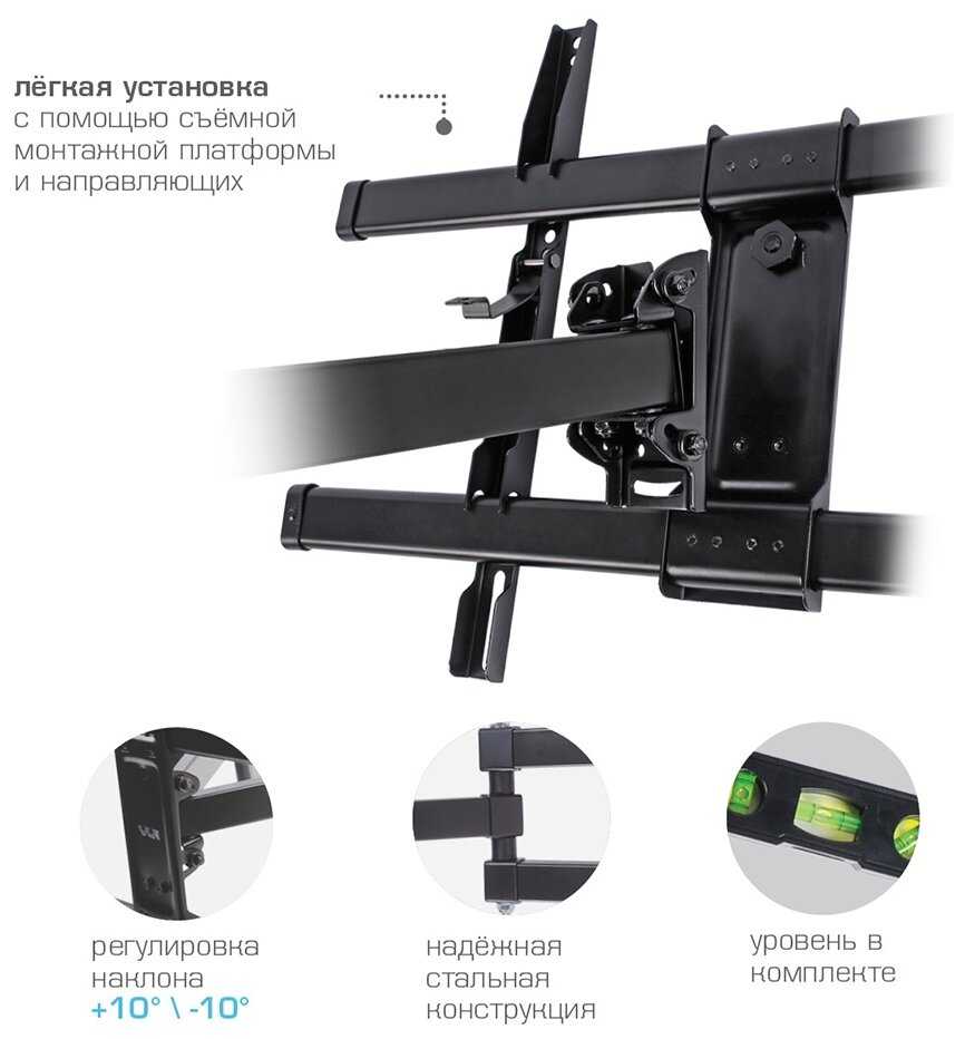 | Дополнительная информация : | Кронштейн для LED/LCD телевизоров 32"-65", max 25 кг, настенный, 4 ст свободы, наклон + 10° -10°, поворот 160°, от стены 73-560 мм, от угла 420-760мм, max VESA 600x400 мм, надежная стальная конструкция, вращение экрана ±3°, возможность установки в угол с креплением к двум стенам. |