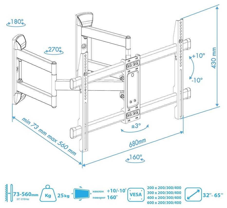 Дополнительная информация : | Кронштейн для LED/LCD телевизоров 32"-65", max 25 кг, настенный, 4 ст свободы, наклон + 10° -10°, поворот 160°, от стены 73-560 мм, от угла 420-760мм, max VESA 600x400 мм, надежная стальная конструкция, вращение экрана ±3°, возможность установки в угол с креплением к двум стенам. |