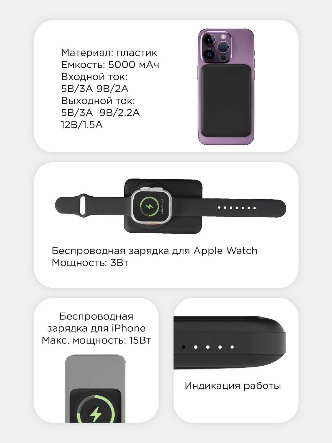 Заряжает айфон 15 про , одну полную зарядку при полном разряде. Удобен, не тяжелый. Практично что есть разъём для провода и тем самым подходит не только для маг сейф. Не много нагревается , не критично , думаю без этого момента , стоимость будет в разы выше . Рекомендую