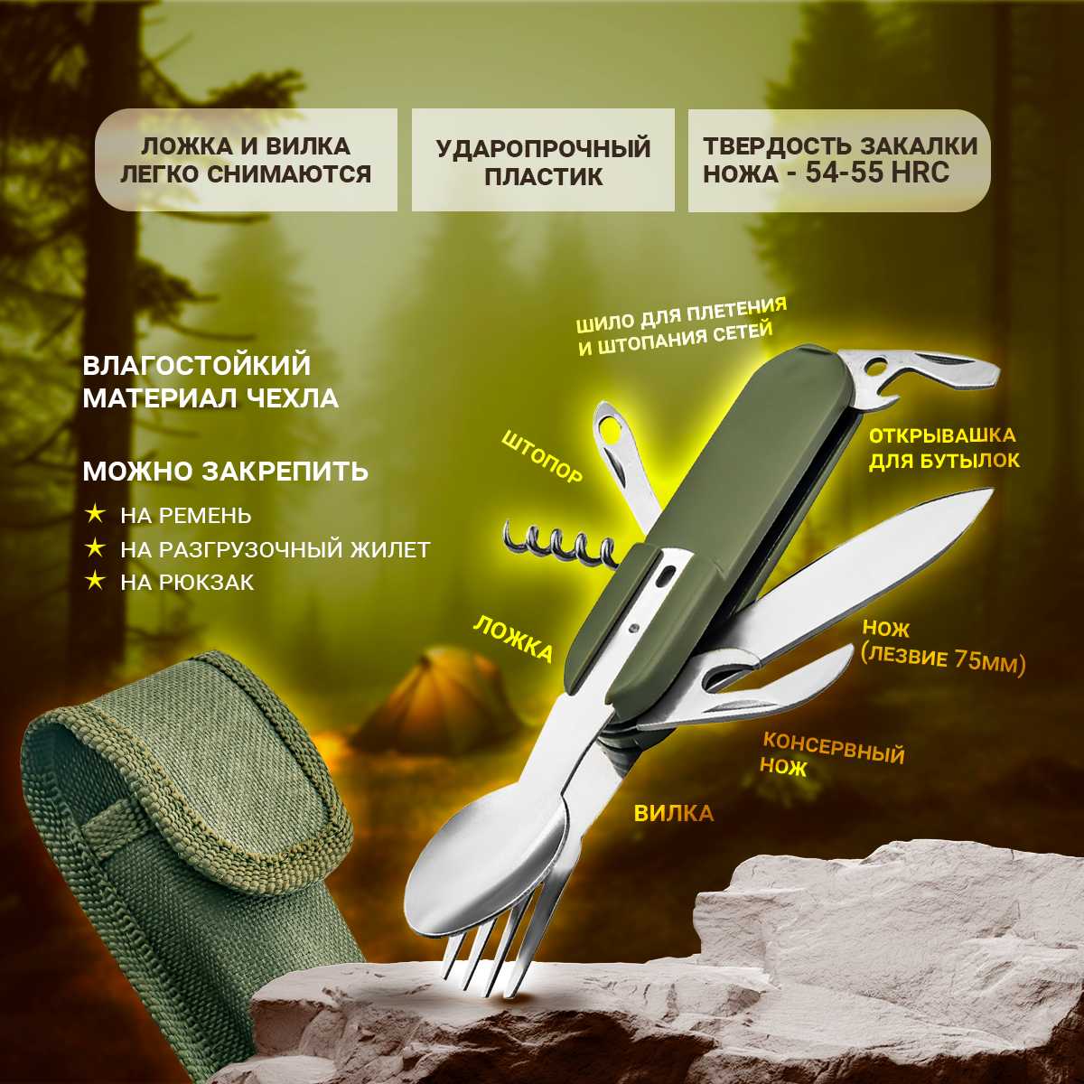 - + очень удобная вещь,взял для долгих прогулок , нож острый ,все материалы качественные ,ложка и вилка отсоединяются ,для походных приемов пиши в самый раз