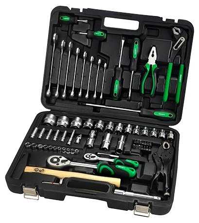 | Инструменты в комплекте : | вороток для головок, клещи, клещи переставные, ключи имбусовые (шестигранные), молоток, отвёртки, пассатижи, трещотка |