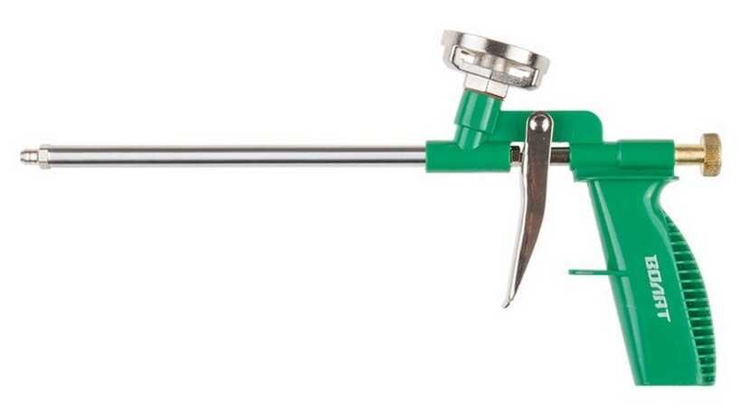 Пистолет для пены купил про запас, была хорошая скидка. Основные узлы из металла, в случае необходимости можно разобрать, почистить. На вес не тяжёлый. в работе пока ещё не пробовал, нет надобности. Из коробки был опрессован воздухом, значит клапана держат. Надеюсь в будущем не подведёт.