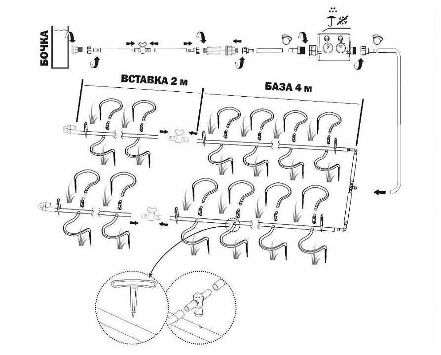 | Комплектация : | электронный таймер - 1 шт, шланг магистральный - 12 метров, прижим для шланга - 4 шт, капельницы - 40 шт, шланг подающий - 40 шт, тройник - 20 шт, Т-образный соединитель - 1 шт, L-образный соединитель - 2 шт, кран - 1 шт, фильтр - 1 шт, шило - 1 шт, элементы крепления к ёмкости (бочке), инструкция по монтажу |