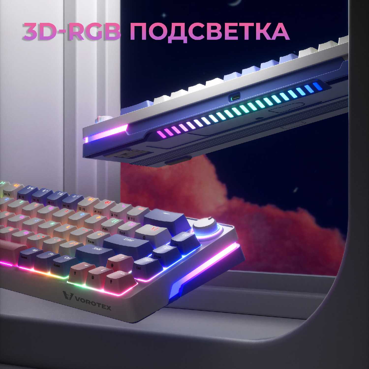- Индивидуальная подсветка каждой клавиши с плавными переходами цветов и множеством режимов (волна, статика, дыхание).