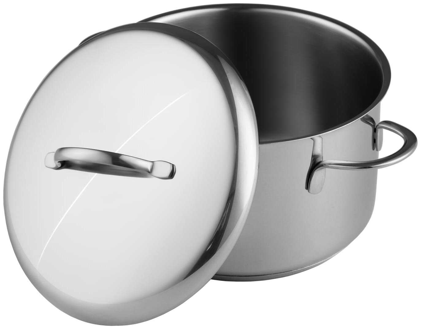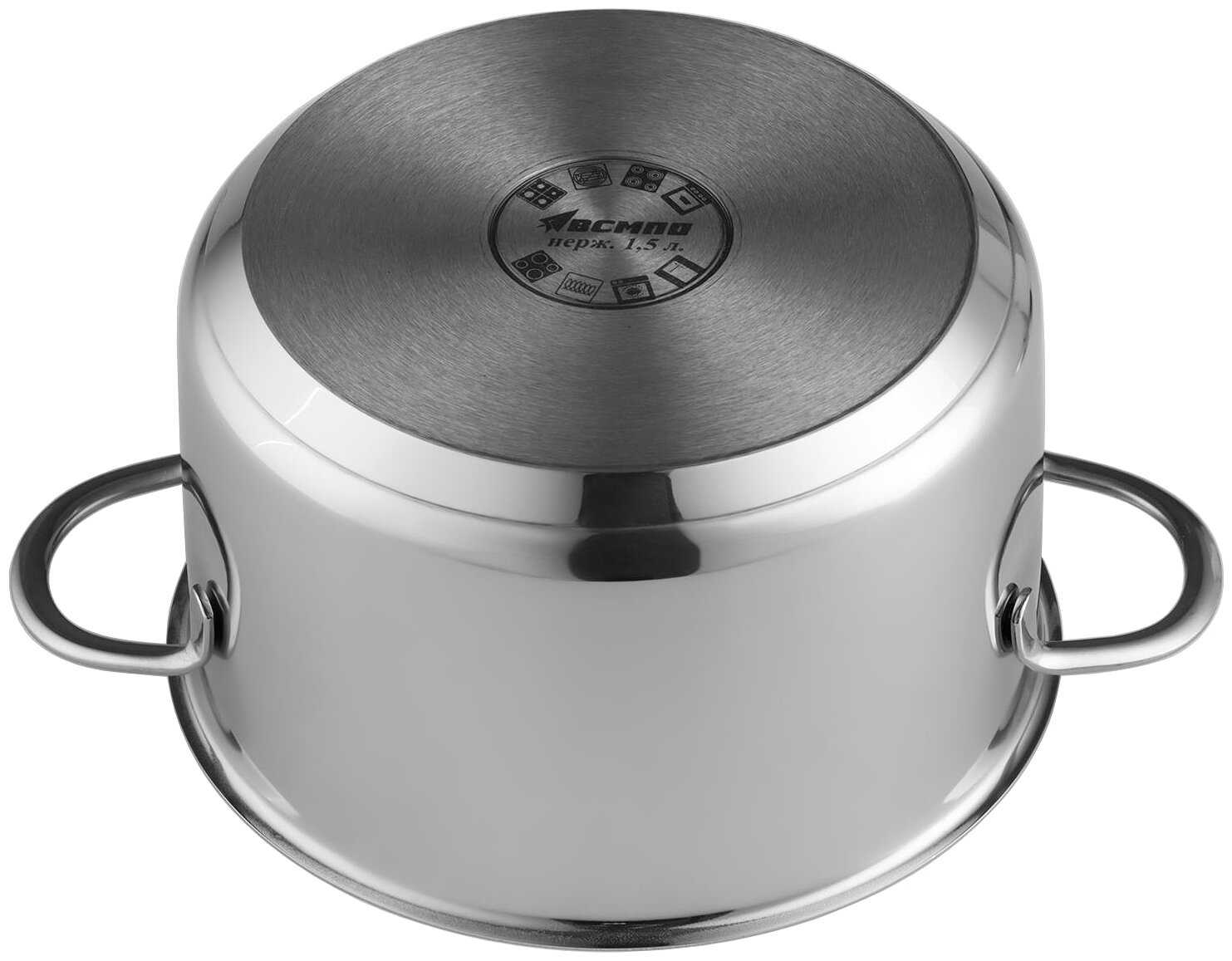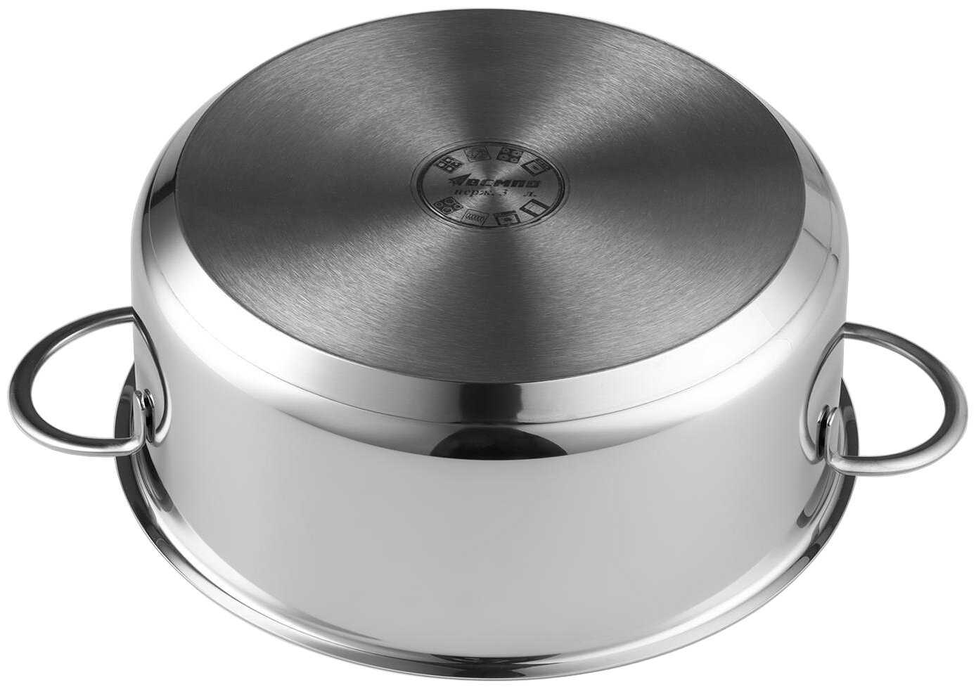 | Дополнительная информация : | трехслойное теплораспределительное дно (сталь-алюминий-сталь), материал крышки: сталь, материал ручек: сталь крепление ручек: точечная сварка, ГОСТ 27002-86, марка стали: AISI 304 18/10 08Х18Н10 |