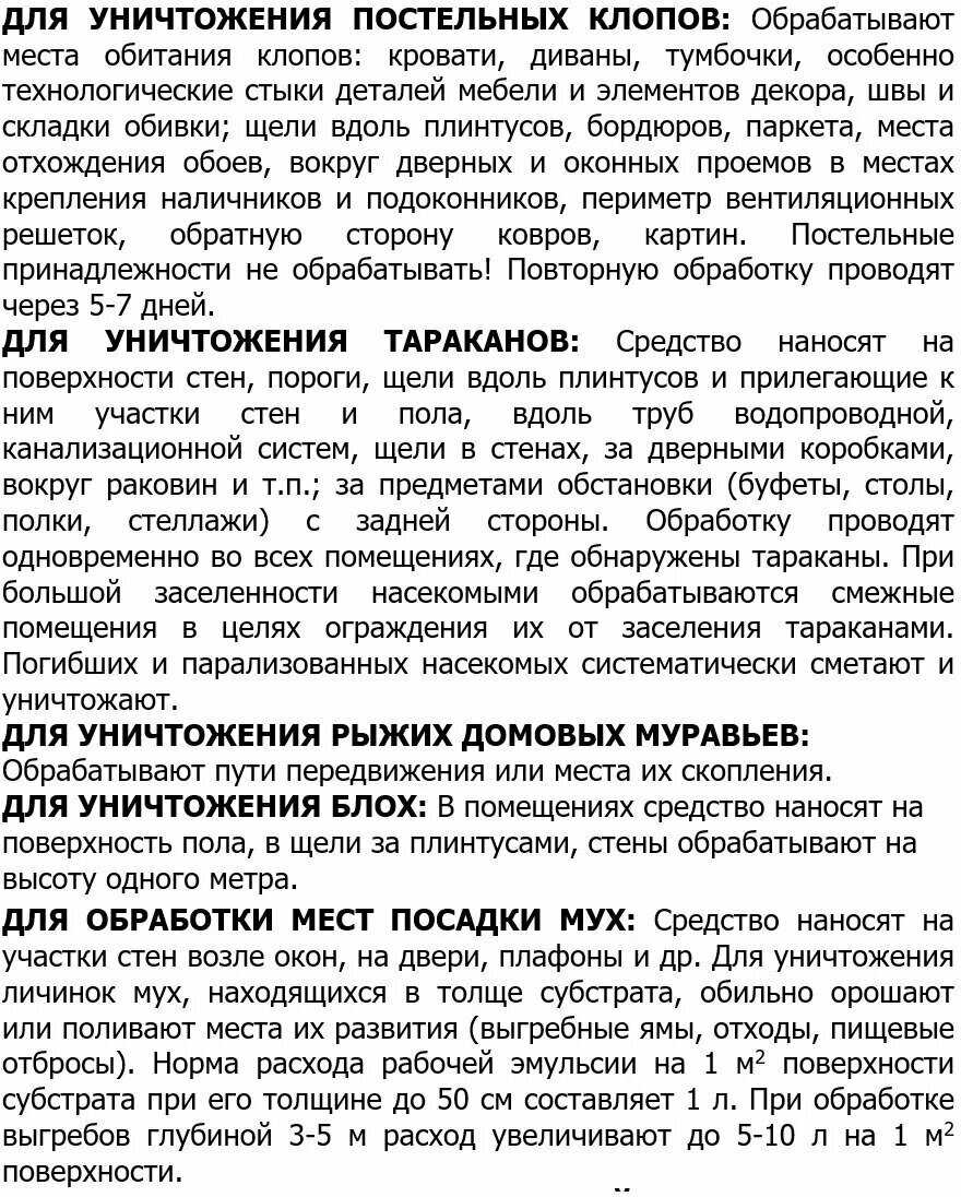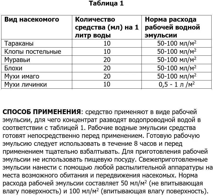 Способ применения : | развести средство водопроводной водой в соотношении: клопы тараканы: 50 мл средства на 5 литров воды, муравьи блохи: 50 мл средства на 25 литра воды, мухи: 50 мл на 5 литров воды. Опрыскать места обитания и передвижения насекомых. |