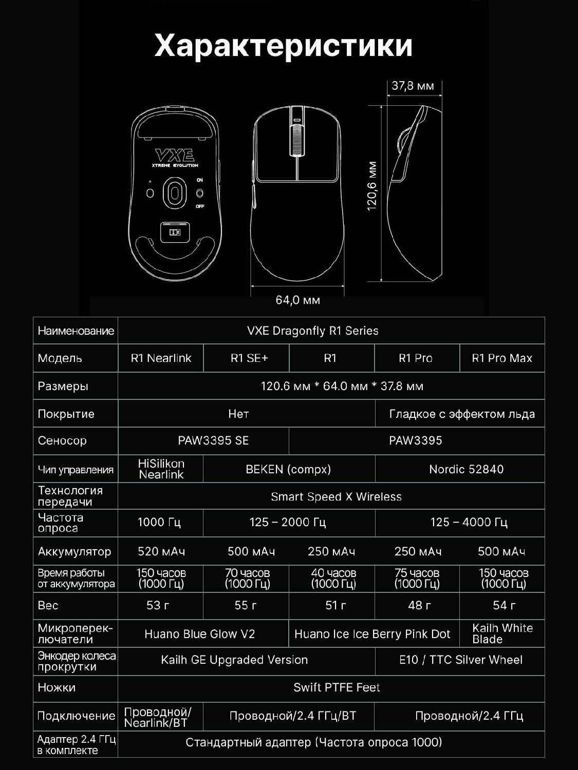 Комплектация : | Игровая мышь АТК x VXE R1 - 1 шт. Кабель Type-C - 1 шт. Ресивер - 1 шт. Глайды - 2 шт. Инструкция - 1 шт. |