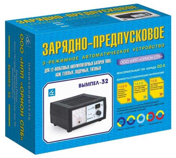 | Подробная комплектация : | Предпусковое зарядное ПЗУ для аккумулятора автомобиля Орион Вымпел 32 и подробная инструкция по эксплуатации |