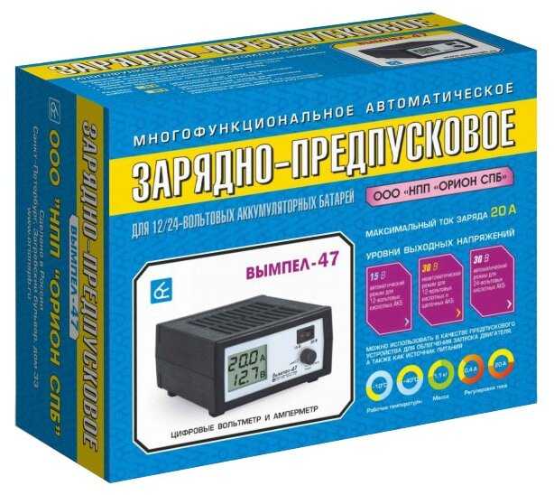 | Функции : | автоматическое отключение зарядки, встроенный амперметр, встроенный вольтметр, предпусковая зарядка |