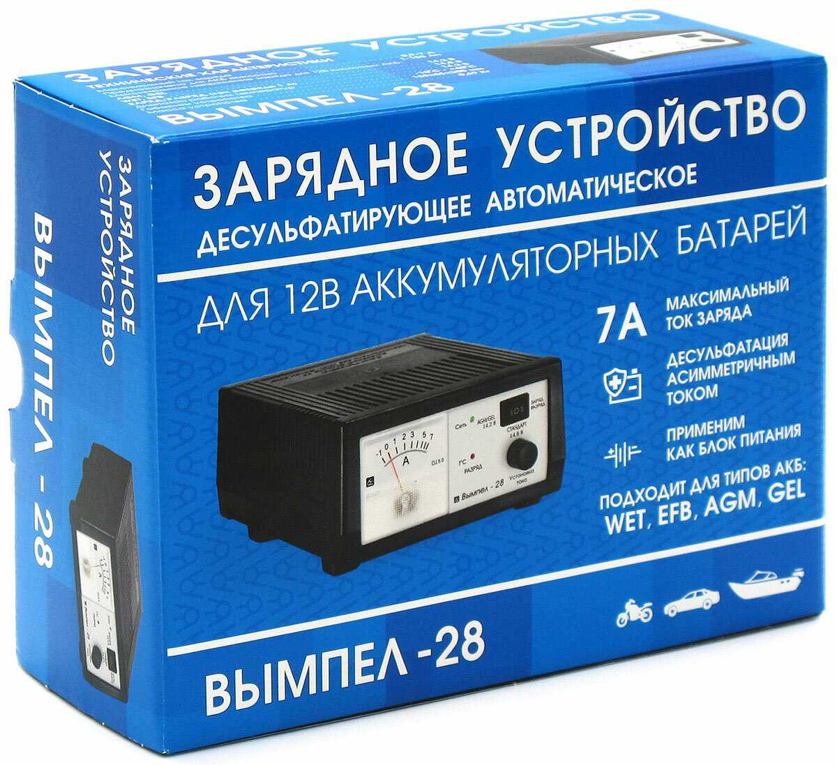 Выбор десульфатирующих з/у невелик . Эта модель имеет встроенную нагрузку , не надо городить какие-то галогенки , или резисторы . Ну а так , если в общем , аппарат весьма достойный . Я вообще фанат ВЫМПЕЛА . Имею два 37-х , один 32 , и этот 28-й , и вилку НВ-04 .