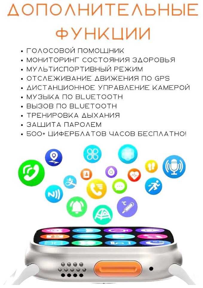 | Дополнительные функции : | альтиметр, барометр, будильник, вибрация, гироскоп, глубина погружения, датчик освещенности, диктофон, динамик, дыхательная гимнастика, календарь, калькулятор, кнопка экстренного вызова, компас, массажер, микрофон, наличие фотокамеры, обнаружение падения, секундомер, таймер, шагомер |