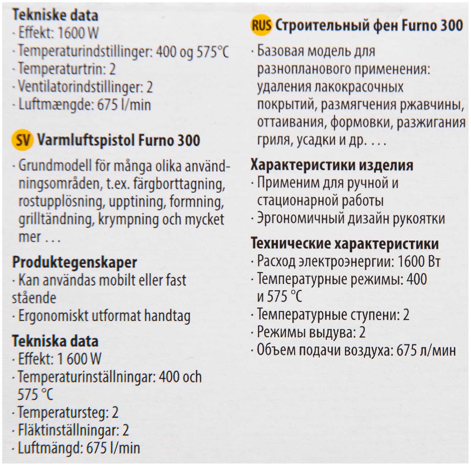 | Дополнительная информация : | Электрический термофен Wagner Furno 300 2359348 используется для небольших проектов или легких работ как внутри помещений, так и снаружи. Он выполнен из ударопрочных, коррозионно-стойких и жаропрочных полимеров, что увеличивает его рабочий ресурс. Модель имеет две настройки температуры: 400 и 575 градусов. |