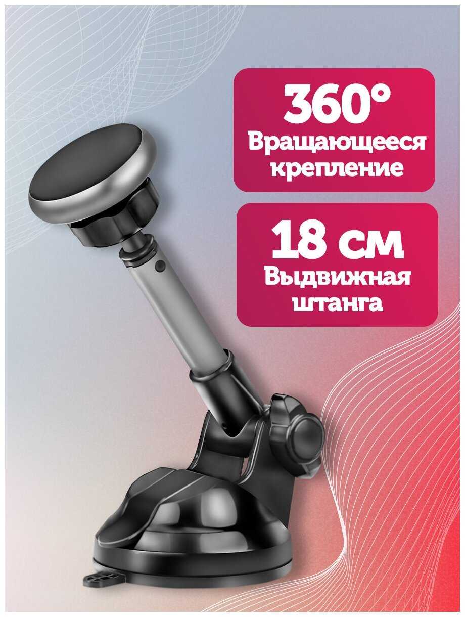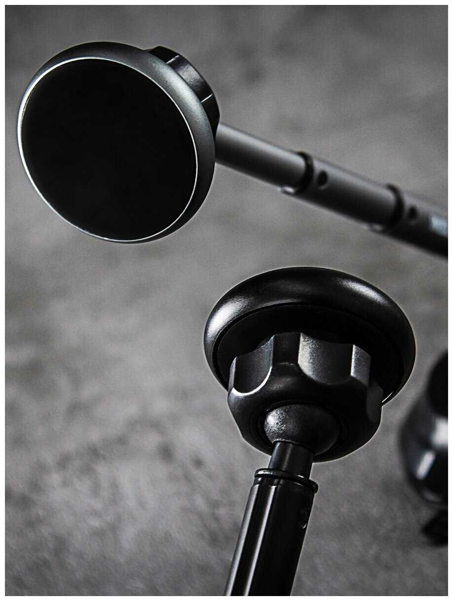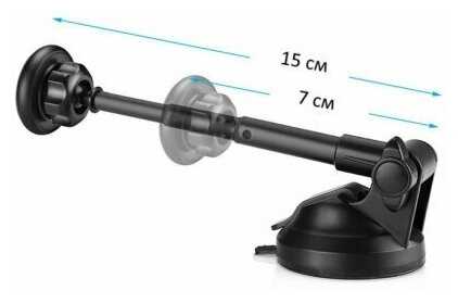 - + Присоска надёжно держится на стекле. Нет гибкой части, которая обычно выполнена из куска аллюминиевой проволоки в пластиковой гофре и со временем разгибается. Приходится подгибать постоянно, по итогу - ломается. В этом держателе - телескопическая штанга и НЕТ такой проблемы. Держатель непосредственно телефона - магнитный. Никаких трещеток, кнопок, снимания двумя руками (давим кнопку, чтобы разошёлся захват и держим телефон, чтобы не упал). Нет захвата - нет ограничения по размеру телефона. Нет проблемы с подключением шнура зарядки к телефону, ему просто не во что упираться. В комплекте две металлические пластины. Одна на двустороннем скотче, наклеивается на телефон, вторая (на ней тоже, но совсем небольшой кругляшок скотча) просто вкладывается в чехол телефона, если пользуетесь таким.