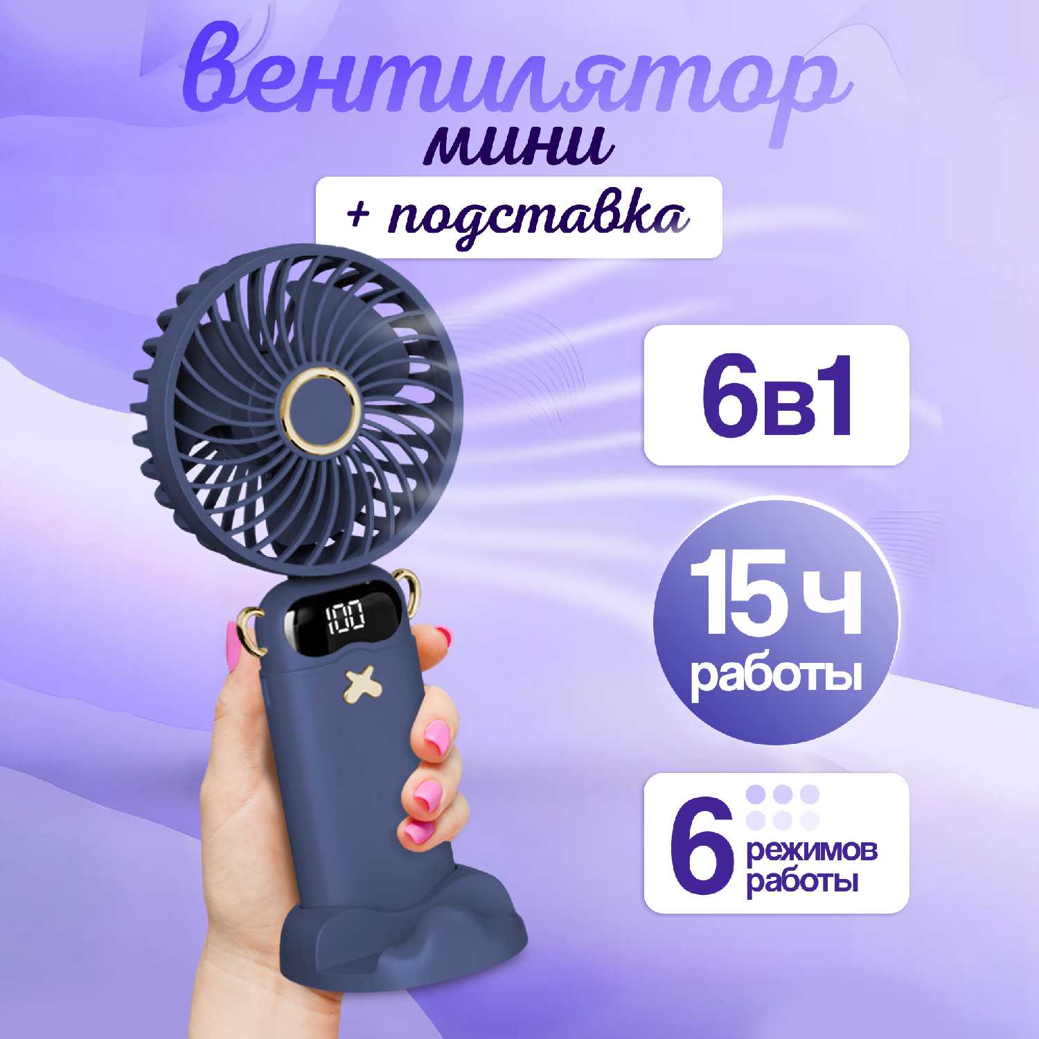- + Компактный, портативный вентилятор. 6 режимов работы. Подставка для телефона. Можно использовать и в автобусе, и в самолете, и в поезде, и на работе.