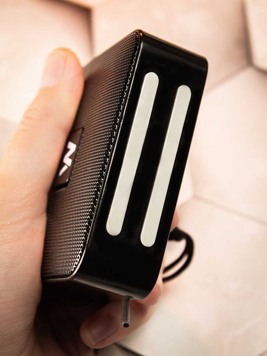 - + Хорошая колонка исходя из ее размера и цены. на колонке кнопки переключения на следующий и предыдущий трек, включения и выключения воспроизведения, включения и выключения блютуз а, есть голосовое сообщение о блютуз -соединении с телефоном