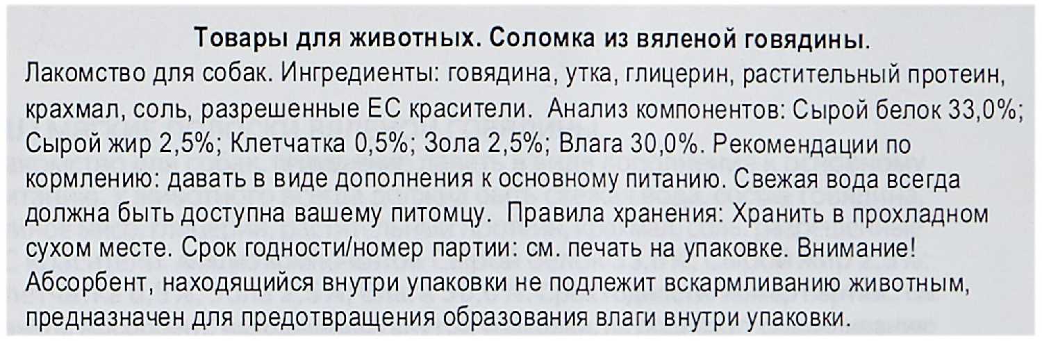 Состав : | говядина утка глицерин растительный протеин крахмал соль разрешенные ЕС красители, анализ компонентов: сырой белок 330% сырой жир 25% клетчатка 05% зола 25% влага 300% |