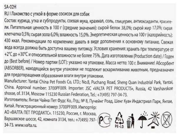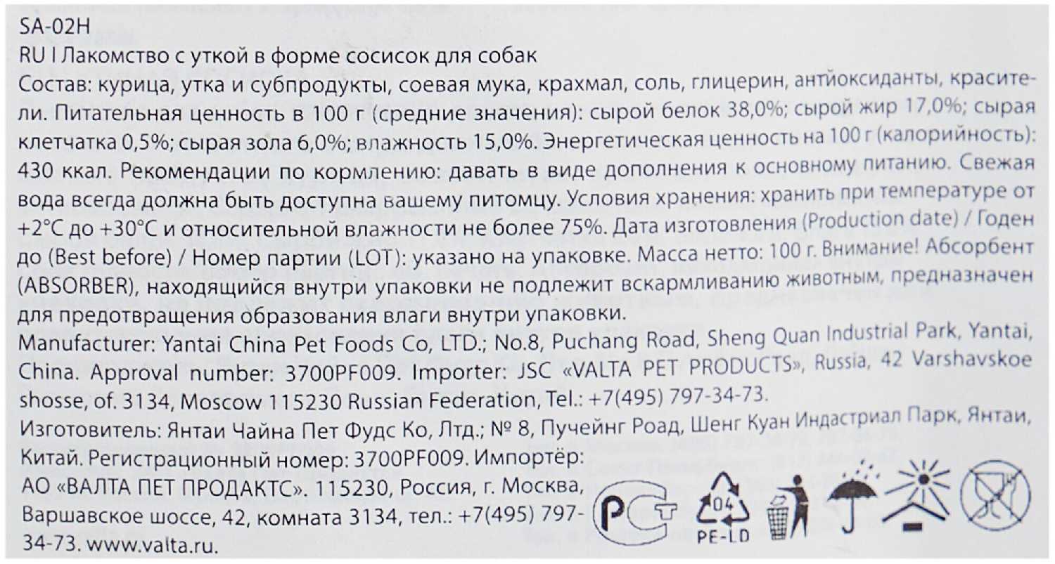 Норма употребления : | давать в виде дополнения к основному питанию, вес собаки: менее 5 кг – 1-2 сосиски/день 5-10 кг – 2-3 сосиски/день 10-20 кг – 3-4 сосиски/день 20-40 кг – 4-5 сосиски/день более 40 кг – 5-6 сосиски/день |