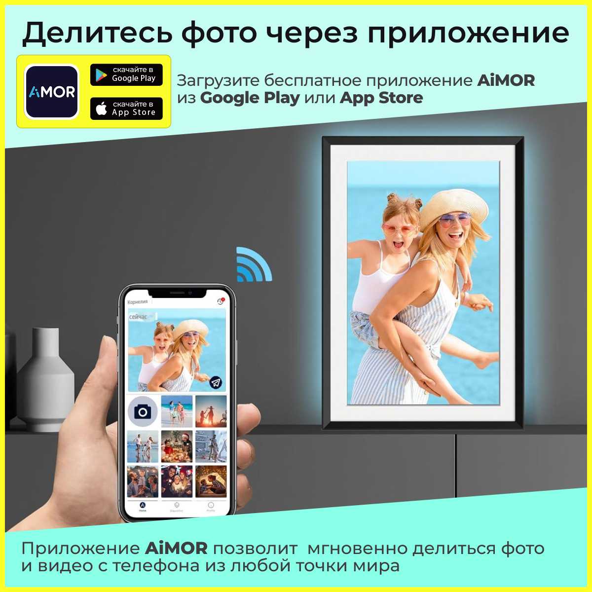 - + Фоторамка подключается к вай фай и можно через приложение передавать фото из любой точки мира. А также ее можно настроить,чтобы она выключалась на ночь.