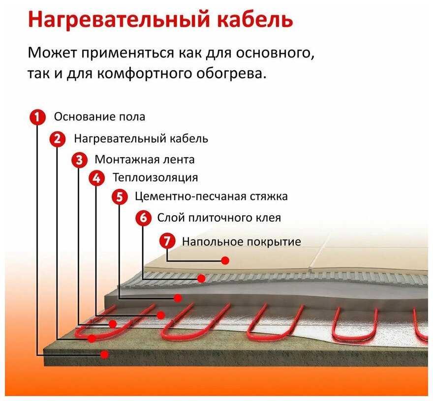 - Диаметр и изоляция кабеля признаны достаточными для надежной и безопасной укладки в слой клея или стяжки толщиной от 6 мм.