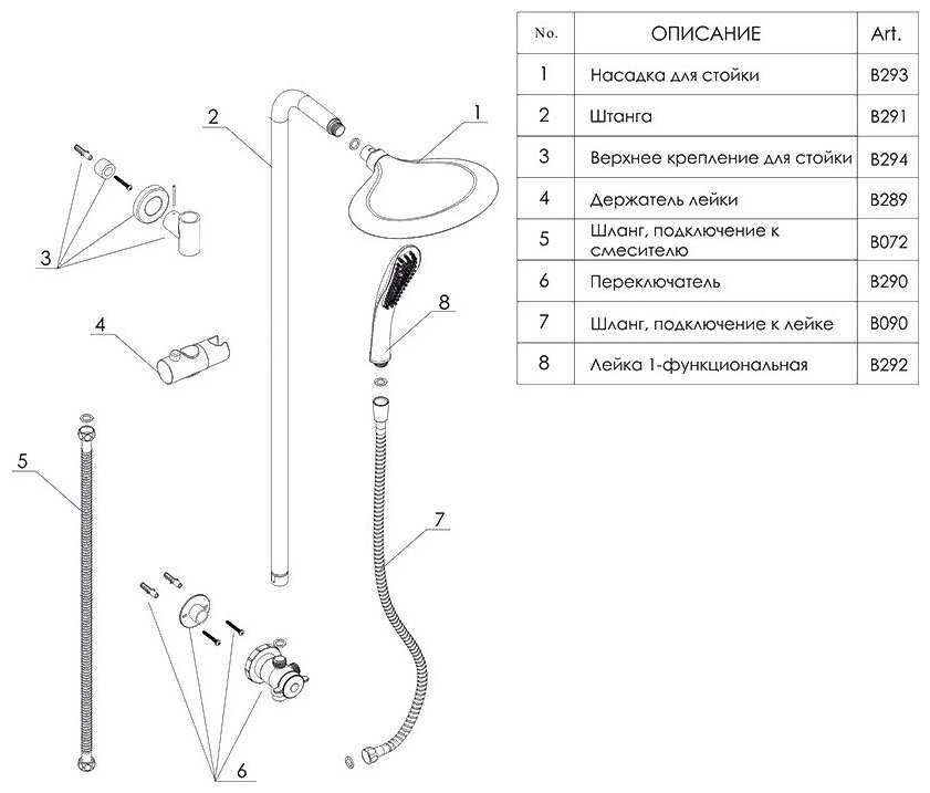 Комплектация : | лейка, шланг, держатель лейки, верхний душ, душевая стойка, смеситель |