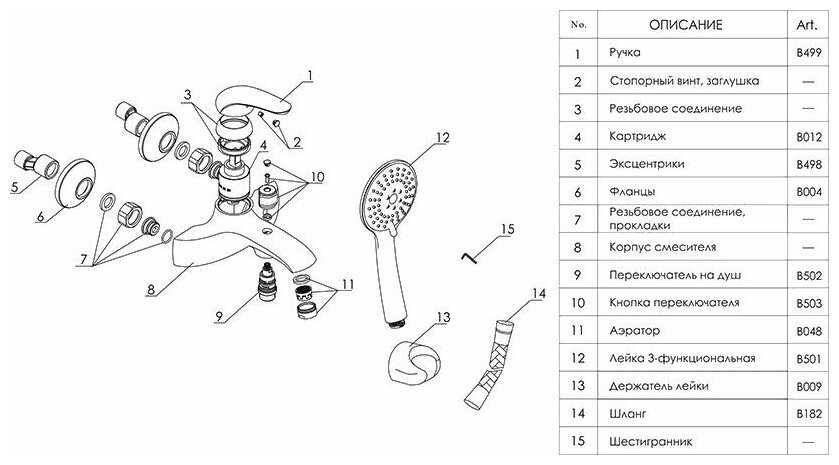 | Комплектация : | держатель лейки, лейка, ручной душ, смеситель, шланг, эксцентрик |