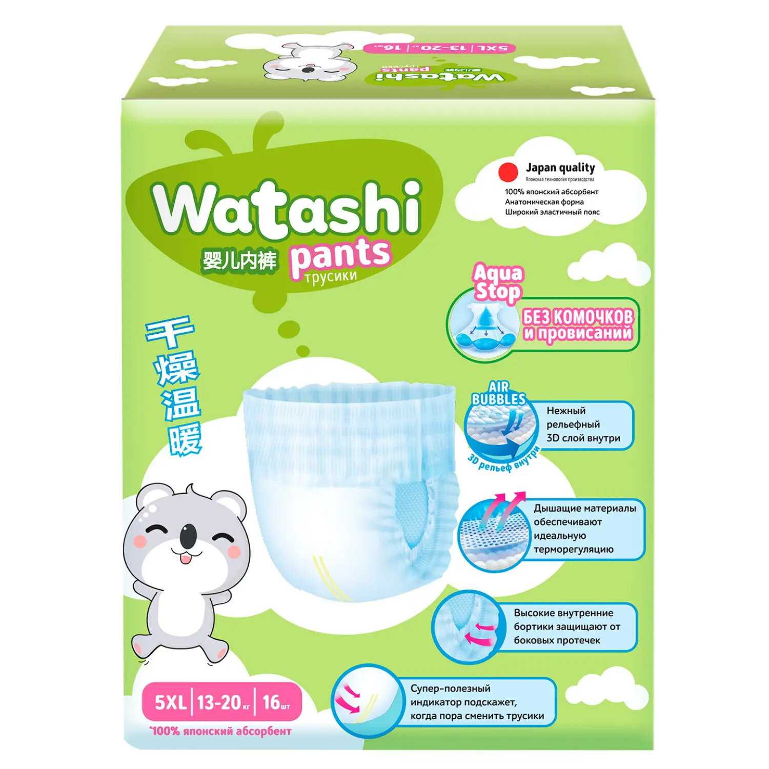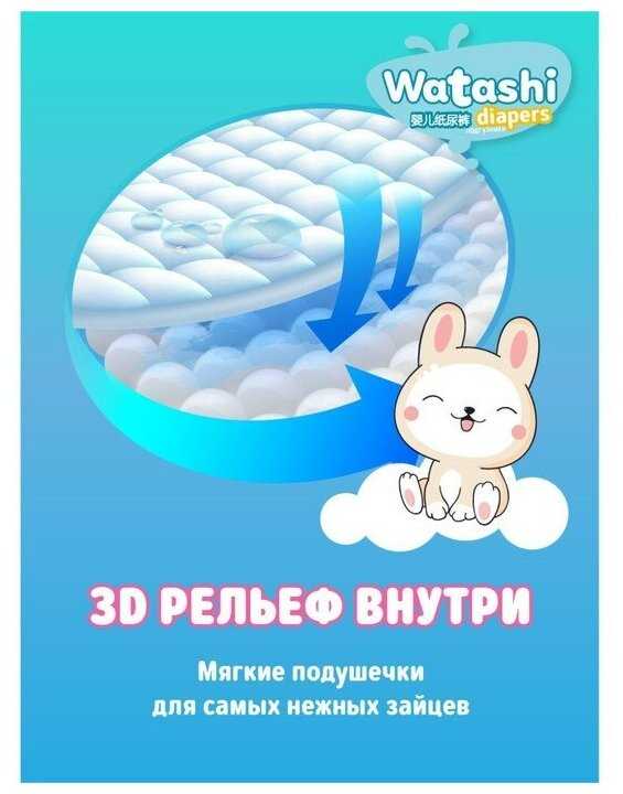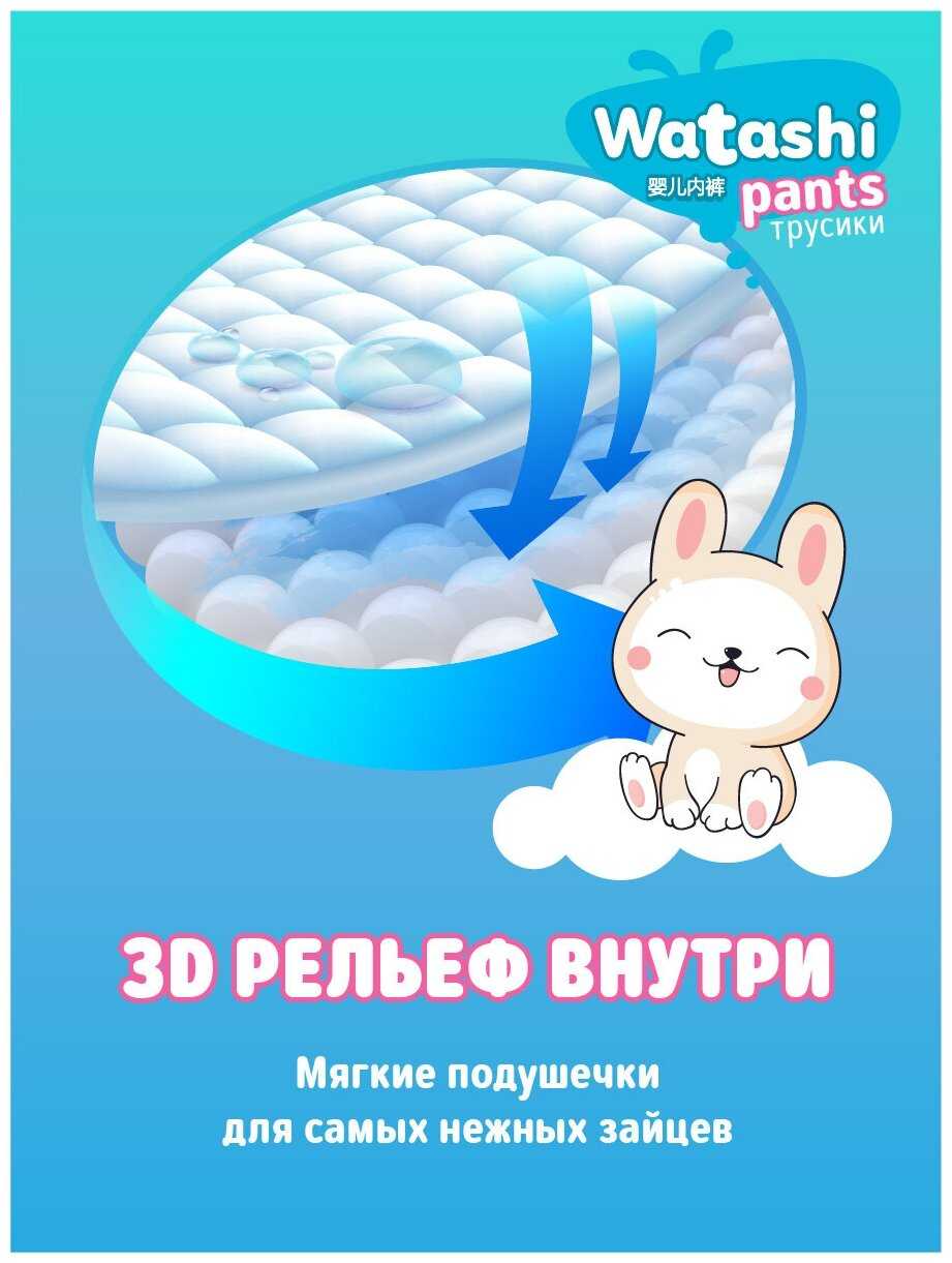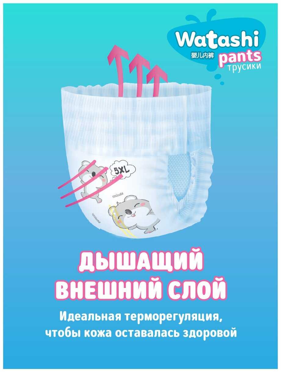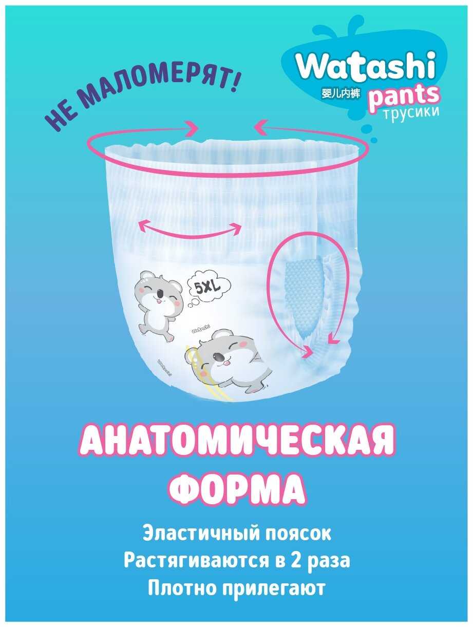 Посадка, размерный ряд и удобство для активного движения: Особенности размерного ряда и посадки. Подавляющее большинство пользователей отмечает, что трусики Watashi отличаются щедрой размерной сеткой и часто «большемерят» по сравнению с другими брендами. Для ребенка весом 10-11 кг часто идеально подходит размер, маркированный 6-10 кг (M), а на детей весом 12-13 кг хорошо садится размер L (9-14 кг). Многие родители, чьи дети имеют пухлую или широкую комплекцию, подчеркивают, что это единственные трусики, которые не оказываются узкими в области ягодиц, в отличие от таких марок, как BabyGo, которые на аналогичном весе и размере могут быть тесными. Анатомическая форма и широкий эластичный поясок обеспечивают плотное прилегание к телу, не оставляя следов на коже живота и спины, при этом не сдавливая их. Благодаря этому трусики не сползают и не съезжают между ягодиц даже во время активных игр, что подтверждается опытом использования для детей, начинающих ходить. Однако для худощавых детей такая посадка может оказаться излишне свободной, особенно в зоне бедер, что в отдельных случаях, по отзывам, приводит к протеканиям, если ребенок спит на животе или активно двигается. Комфорт и влияние на подвижность ребенка. Конструкция трусиков, по многочисленным наблюдениям, предотвращает их провисание и сминание в комок между ног, что позволяет ребенку свободно бегать и играть. Пользователи особо выделяют, что даже в наполненном состоянии подгузник не свисает мешком и не заставляет ребенка ходить «нараскорячку». Этому способствует трехканальная система распределения влаги, описанная в отзывах: жидкость распределяется вдоль специальных каналов, а не скапливается в одном месте в виде тяжелого комка. Высокие, но при этом мягкие барьерчики вокруг ножек эффективно защищают от боковых протеканий, не натирая нежную кожу. Удобство для самостоятельного использования при приучении к горшку подтверждается тем, что боковые швы легко и надежно рвутся, позволяя ребенку или родителю быстро снять трусики. Сравнение с конкурентами по эргономике. В сравнении с рядом популярных марок, таких как Merries, Moony, Huggies, Pampers и Libero, трусики Watashi часто характеризуются как более широкие в тазовом поясе. Для одних детей это является ключевым преимуществом, решающим проблему сдавливания и дискомфорта, для других — причиной неидеальной посадки. Отмечается, что по удобству и отсутствию комкования они находятся на уровне премиальных линеек Yokosан Premium, в то время как обычные Yokosан могут уступать. При этом некоторые пользователи, имевшие опыт использования японских брендов премиум-сегмента, таких как Genki! или Goo.N, указывают, что Watashi в конкуренцию с ними по совокупности параметров не вступают, но предлагают достойное качество за свою ценовую категорию.