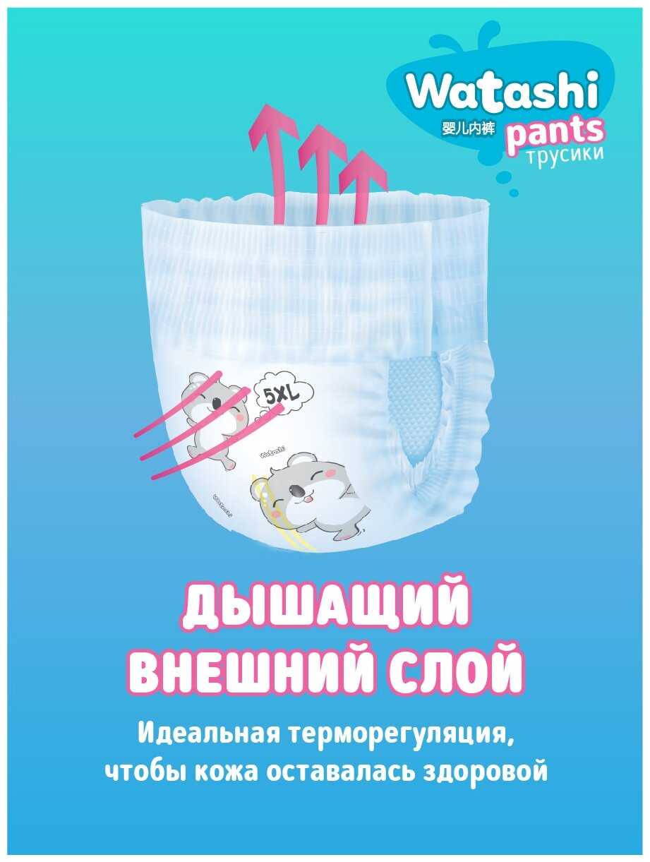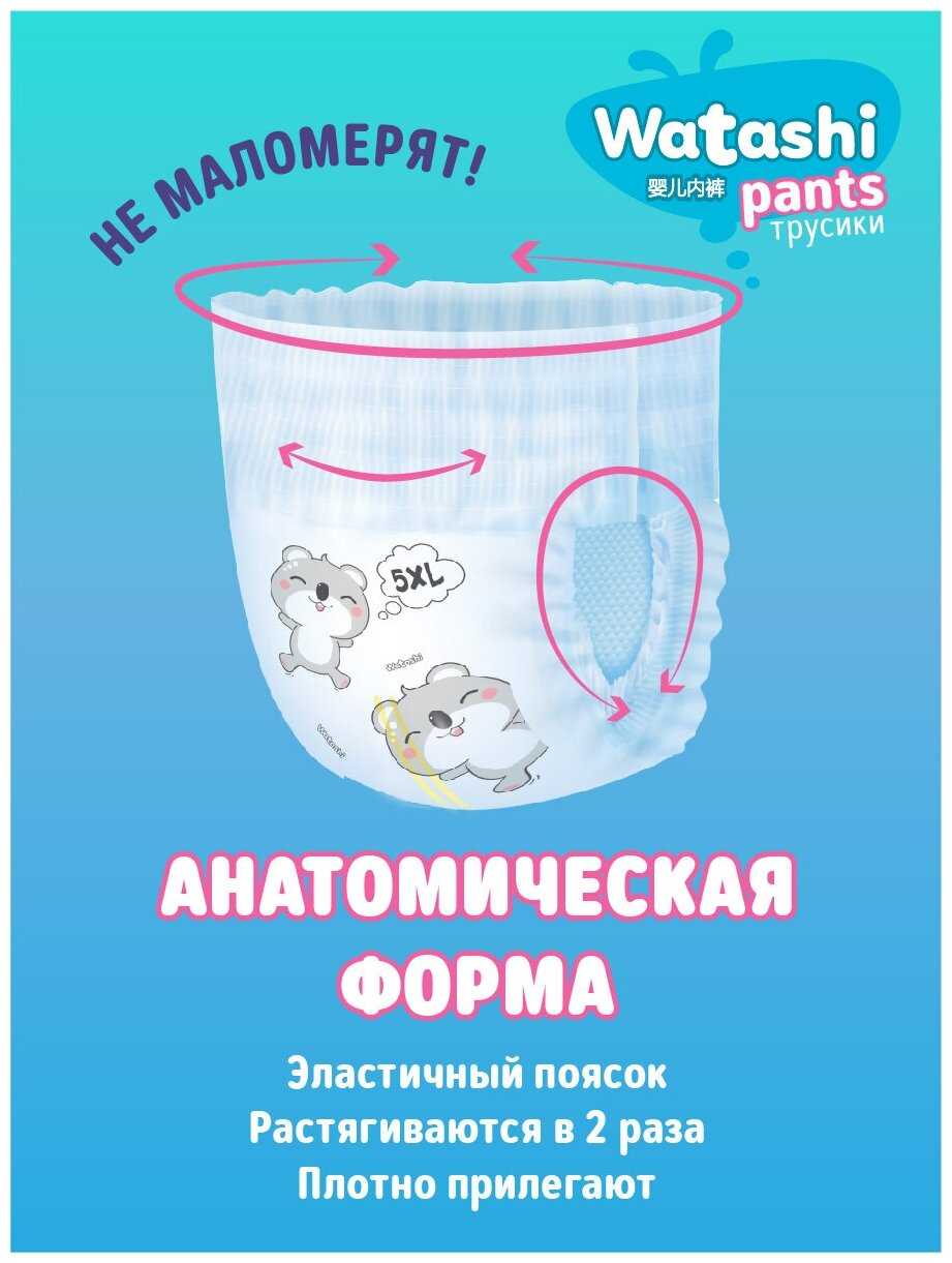 Надежность в роли ночных подгузников. Опыт использования в качестве ночных подгузников разделился. Для многих детей с умеренным диурезом трусики Watashi оказываются надежным решением на всю ночь, не протекают и не образуют «пузырь». Однако есть многочисленные сообщения о протечках во время ночного сна, особенно если ребенок много пьет перед сном, спит на боку или животе, или если подобран размер с запасом. Это делает их не универсальным решением для всех детей в ночное время, и их надежность в этом качестве сильно зависит от индивидуальных физиологических особенностей ребенка и точности подбора размера. Родители, чьи дети являются «обильно писающими», часто предпочитают использовать эти трусики для дневной носки или прогулок, где контроль и смена происходят чаще.