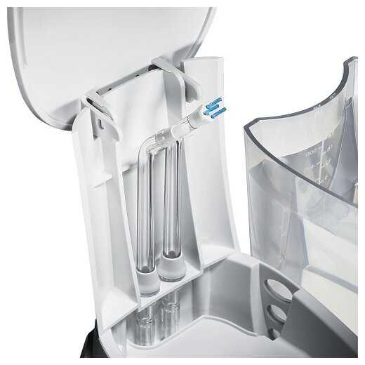 - + Исторический бренд. Большой объем резервуара для воды, полный комплект насадок - для всей семьи так сказать, ну или использовать часть насадок, как запасные. Большой диапазон регулировки давления, а также два режима работы подачи струи: для зубов и для десен. Встроеный отсек на 2 повседневных насадки.