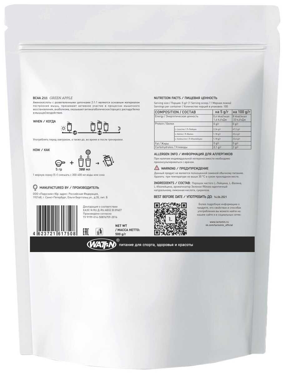 10 отзывов пользователей o Watt-N WATT NUTRITION BCAA 2:1:1 Зелёное Яблоко 500 гр.