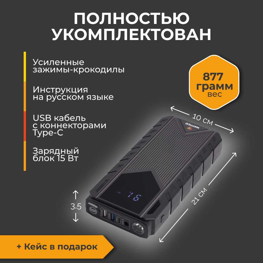 Подробная комплектация : | Пусковое устройство, блок питания, умный силовой кабель с крокодилами |