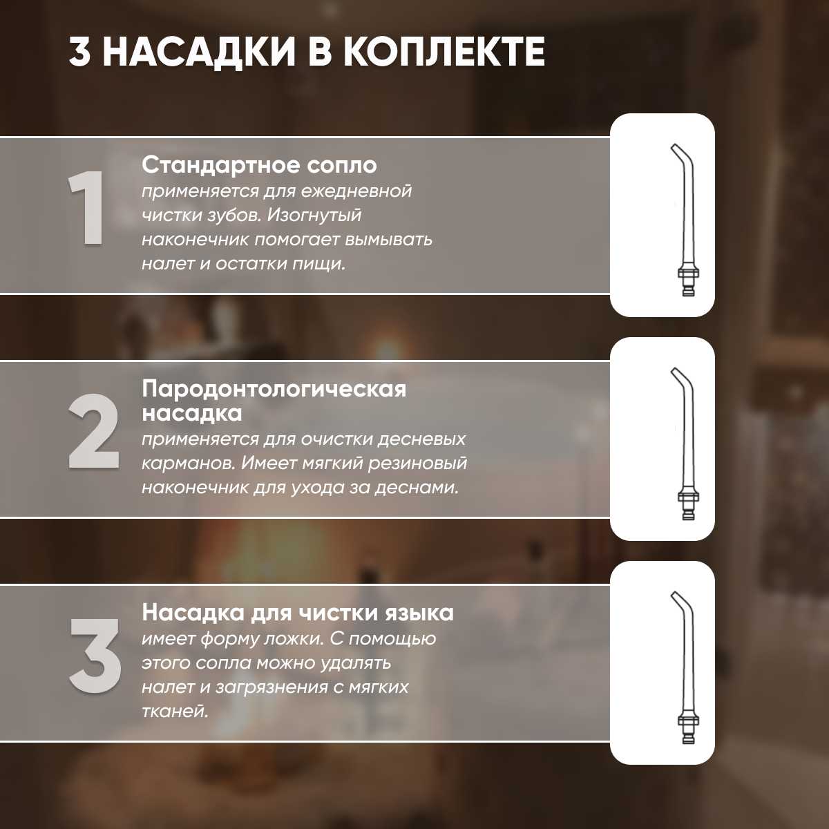 Когда пришёл ирригатор был запах пластмассы небольшой, но позже помыла его хорошо и запах ушёл. Прекрасное дополнение - это различные насадки к нему. Есть даже насадка для очищения языка и это значительно облегчает процесс чистки