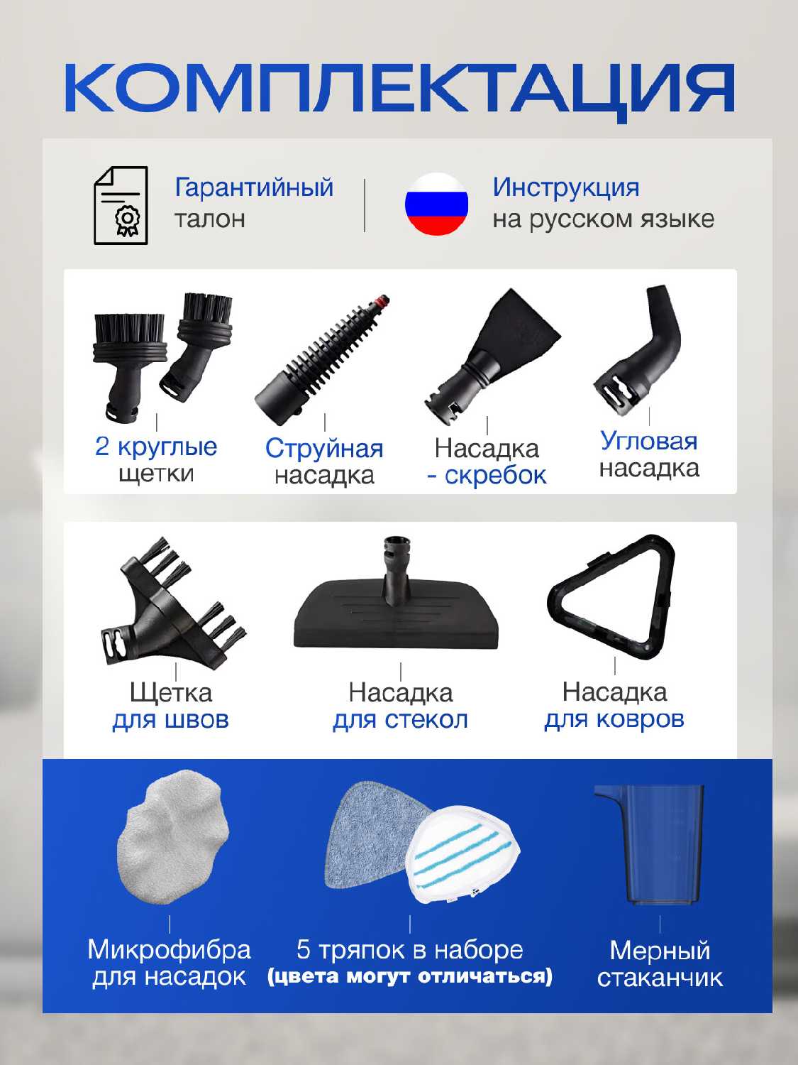 - + Много насадок, возможно даже лишних которые могут не понадобиться, есть дополнительные тряпочки сменные для мытья полов...длинный шнур