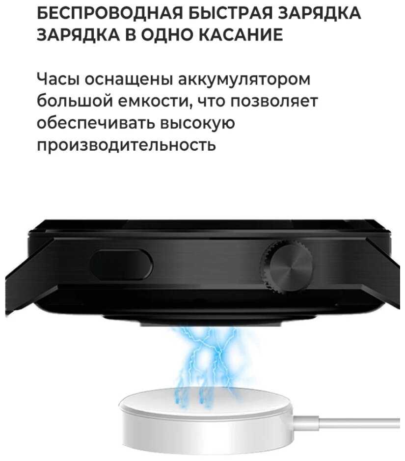 Магнитная зарядка присоединяется к задней панели часов. Полная зарядка от 0% до 100% занимает 1.5-2 часа. Пользователи рекомендуют использовать оригинальный кабель — сторонние адаптеры могут вызывать перегрев. -